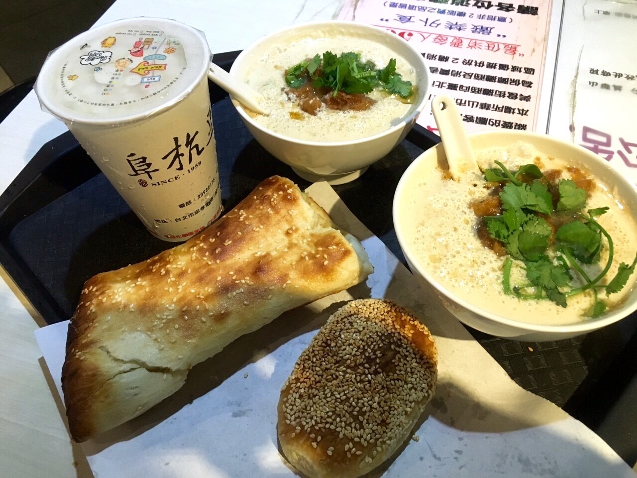 鹹豆漿と冷たい豆乳とキャラメルみたいな台湾のパイと卵焼きの入ったパン食べました!