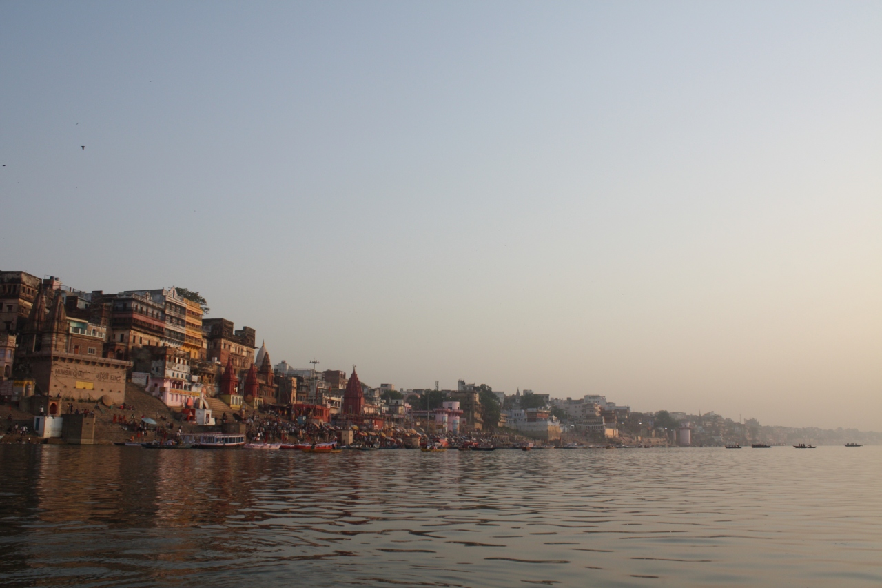 バラナシ観光のハイライトはガンガーのボートでしょう。前日の夜に出会った地元の青年に2人200Rsで手配してもらいました。まずは対岸をめざし、そこからマニカルニカー・ガート、ダシャーシュワメード・ガートを見学しました。ゆったりとした河の流れの中で、目の前の光景をぼんやりと眺めていると、今インドにいることを強く実感します。