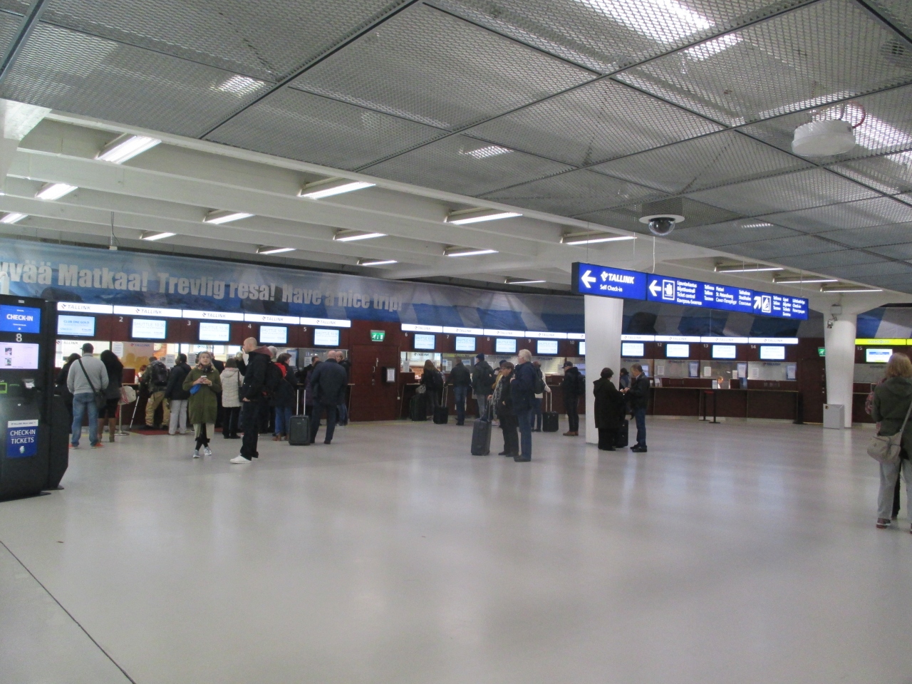 ヘルシンキ中央駅から行く場合は、トラムの9番に乗って終点のLansiterminaaliまで行けば目の前。ターミナルに入って2階へ上るとチェックインのカウンターがあります。