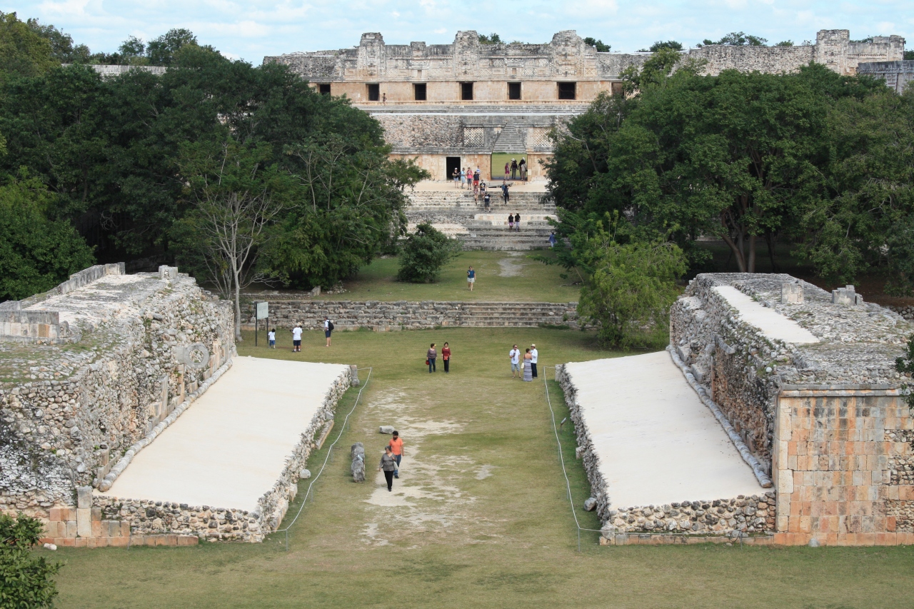 マヤの都市には必ず建設されていたという球戯場。チェチェンイツァのものと比べると随分とこじんまりとしたサイズですが、その代わり保存状態はかなり良いと思います。総督の宮殿に上ると全景が見渡せますのでオススメです。