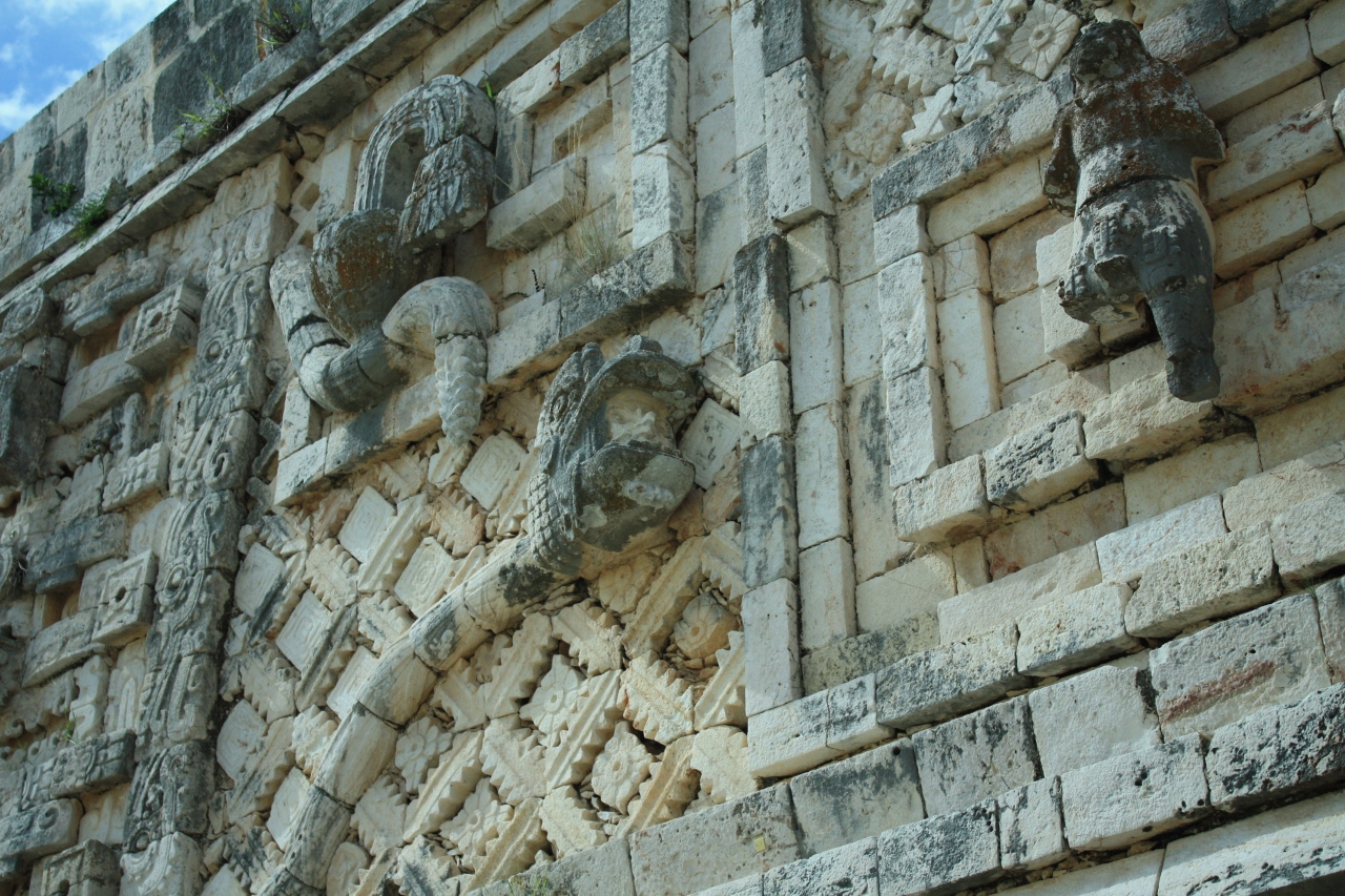ウシュマルは特にプウク様式が美しいことで知られていて、尼僧院の壁面はそのプウク様式づくしでした。プウク様式というのは石灰岩の切石を積み重ねて建造したユカタン半島独特の様式で、雨の神チャックなどの神々が一面に掘り込まれています。