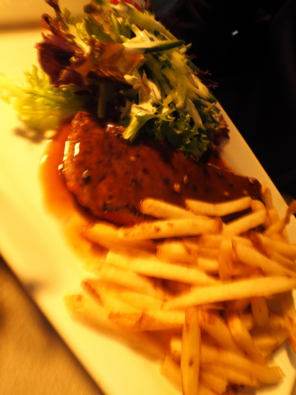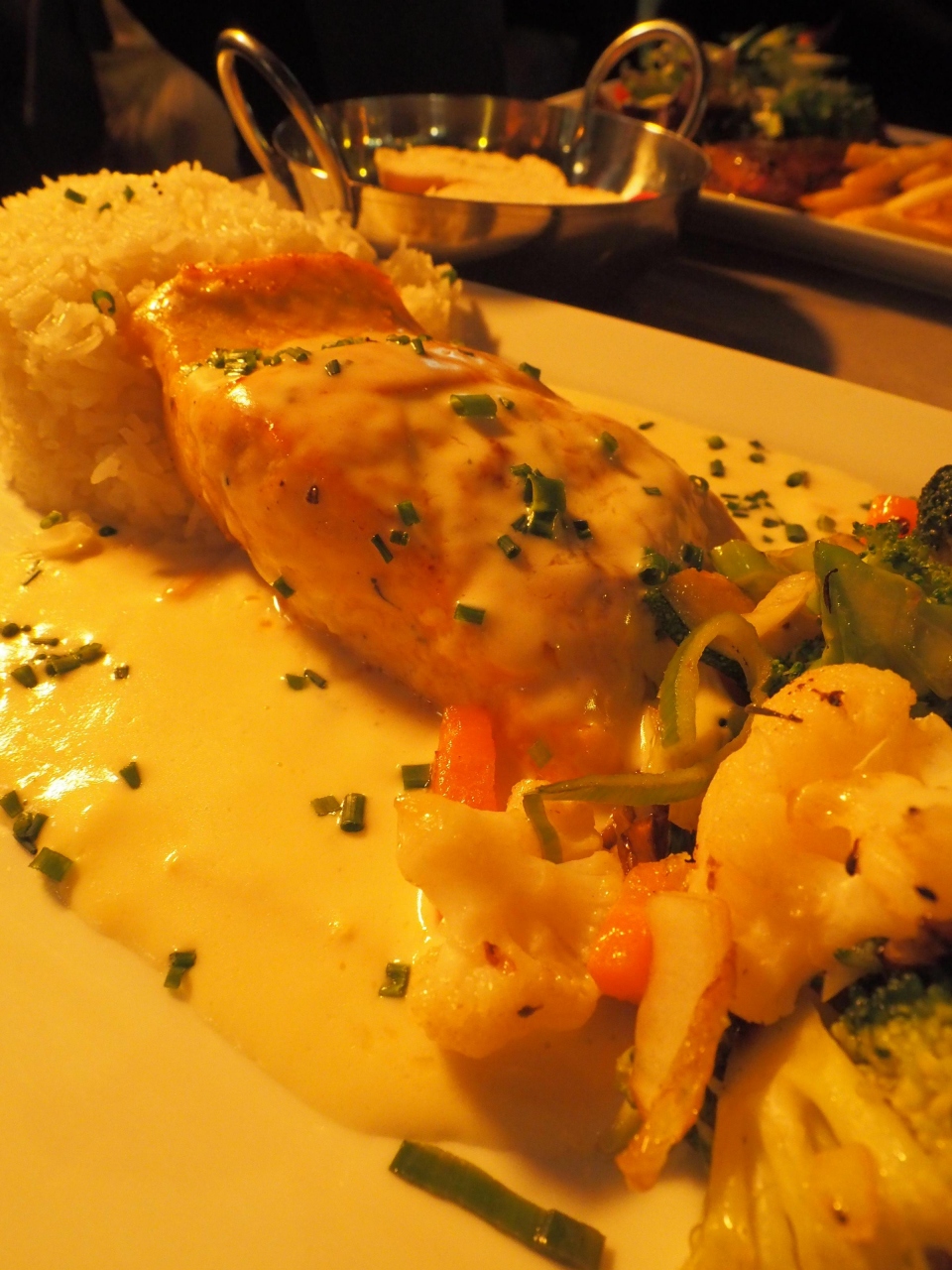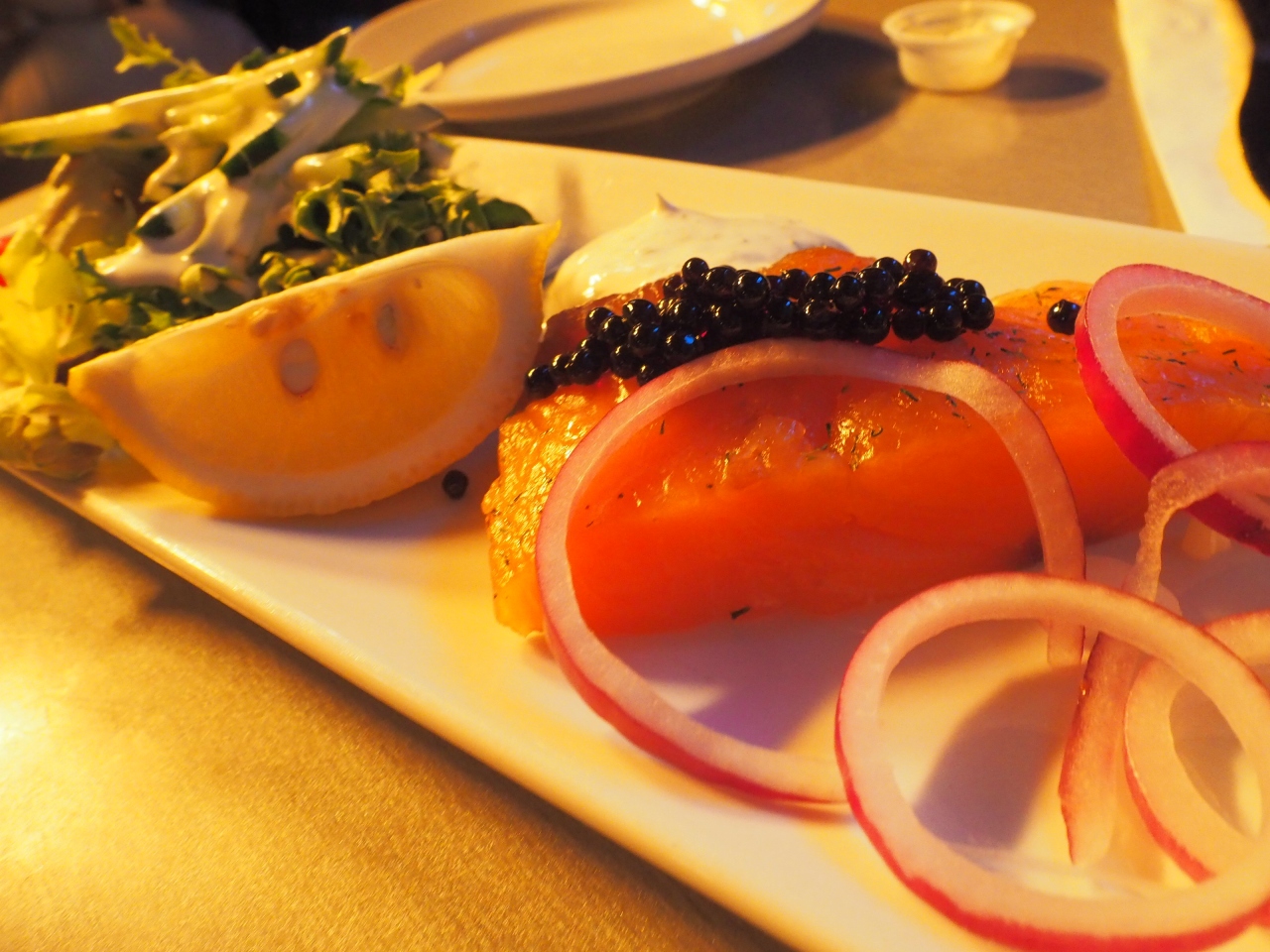 サーモンのマリネはまったり濃厚で美味、サーモングリルも濃い目のソースがぴったり、ステーキも程よいボリュームで美味しくいただきました。