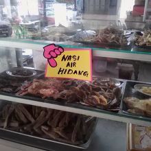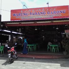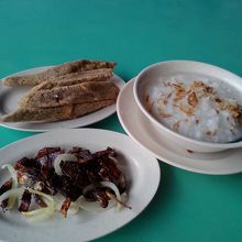 店の名前が変わっていました。現在は「Warung Padang Garong」。オレンジ色の看板が目印です。ここは4〜5軒の店が入ったら小さなフードコートのようなところです。麺類やご飯系はもちろんありますが入口近くに旧店名でもある「Nasi Air Hidang」という文字を見つけたのでトライしてみることに。名前からしてお粥のようなものだとわかりましたが、ガラスケースの中には魚の干物がずらり。2種類を指差しオーダー。で、運ばれてきたのは魚を油で炒めたもの2皿とお粥。なんのひねりもなくそのまんまでした。味も見たまんまです。これで5RM。あまり腹はふくれないし普通の飯を食べたほうがいいです。昼食で食べたましたが周りで食べてる人を見かけなかったのでおそらく朝食用ではないかと思います。気になる方はトライしてみて下さい。