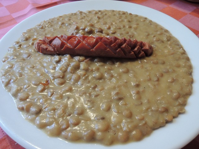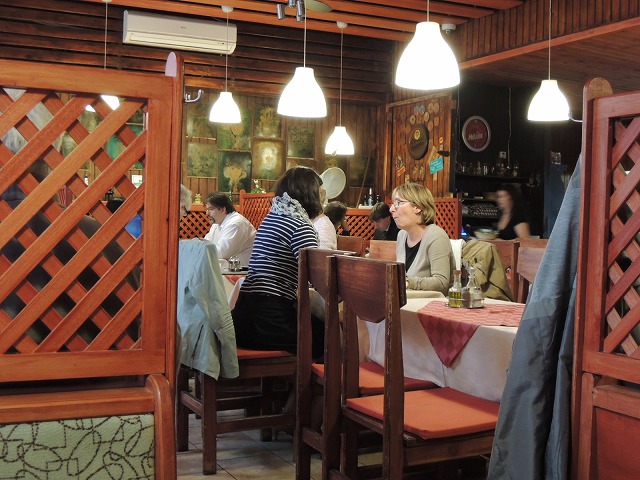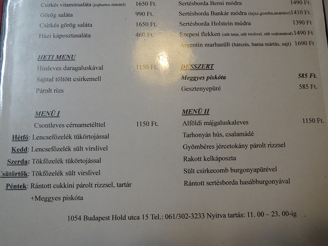 旧郵便貯金局を見学した後、ここでランチを食べました。この近辺はビジネス街で周辺にはあまりお店が見当たらず、ランチタイムは結構混んでいました。注文したのは「パスタスープと揚げソーセージレンズ豆添え」の日替わりランチ(1150フォリント)とグヤーシュスープ(580フォリント)で、どちらも美味しくいただきました。