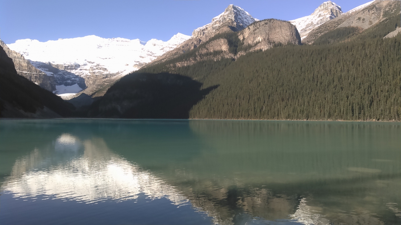 ツアーで訪問しました。水の色は不思議なエメラルドグリーン。氷河が削り取った細かい泥が湖に溶けているからだそうです。両側に深い針葉樹の緑に覆われた山稜と、湖水の向こうには立ちふさがるような巨大な氷河。カナダに来た実感が湧きます。