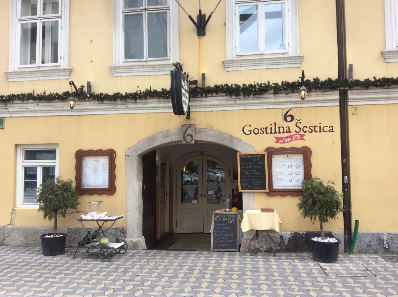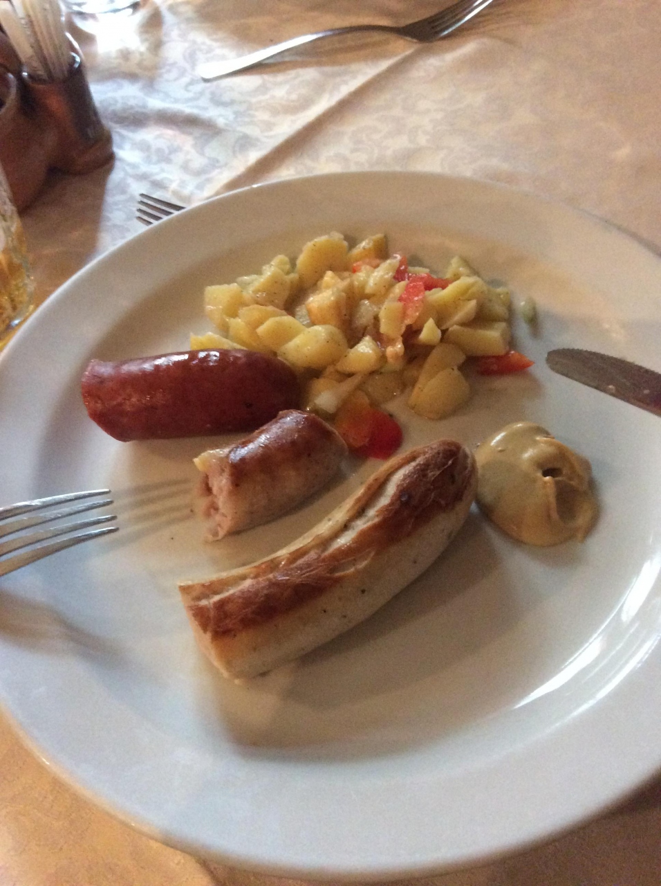 リュブリアナ市内観光の途中でスロベニア伝統料理を食べました。ハム、サラミ、ベーコンの前菜にメインはソーセージでした、ビールのつまみには最高でしたが付け合わせも少なくパン沢山食べました。スロベニアのソーセージはここでも、ホテルでもイマイチ‥‥でも雰囲気は暖かみのあるレストランでした。