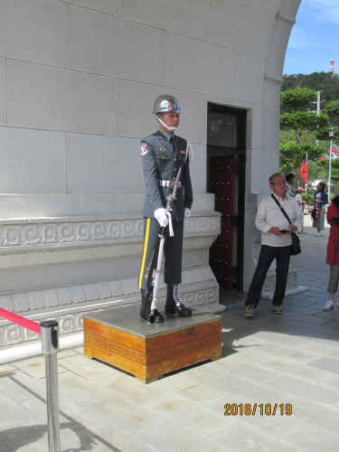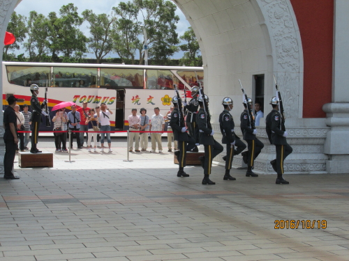 交替時の一糸乱れぬ行進、立哨中は微動だにいたしません。見ていても心地良いものです。選ばれた優秀な人でないとこの役は出来ないそうです。毎日何回も行進するので地面が歩く所だけ変色しています。現在は中国人観光客が減って静かに衛兵交替を見る事ができます。