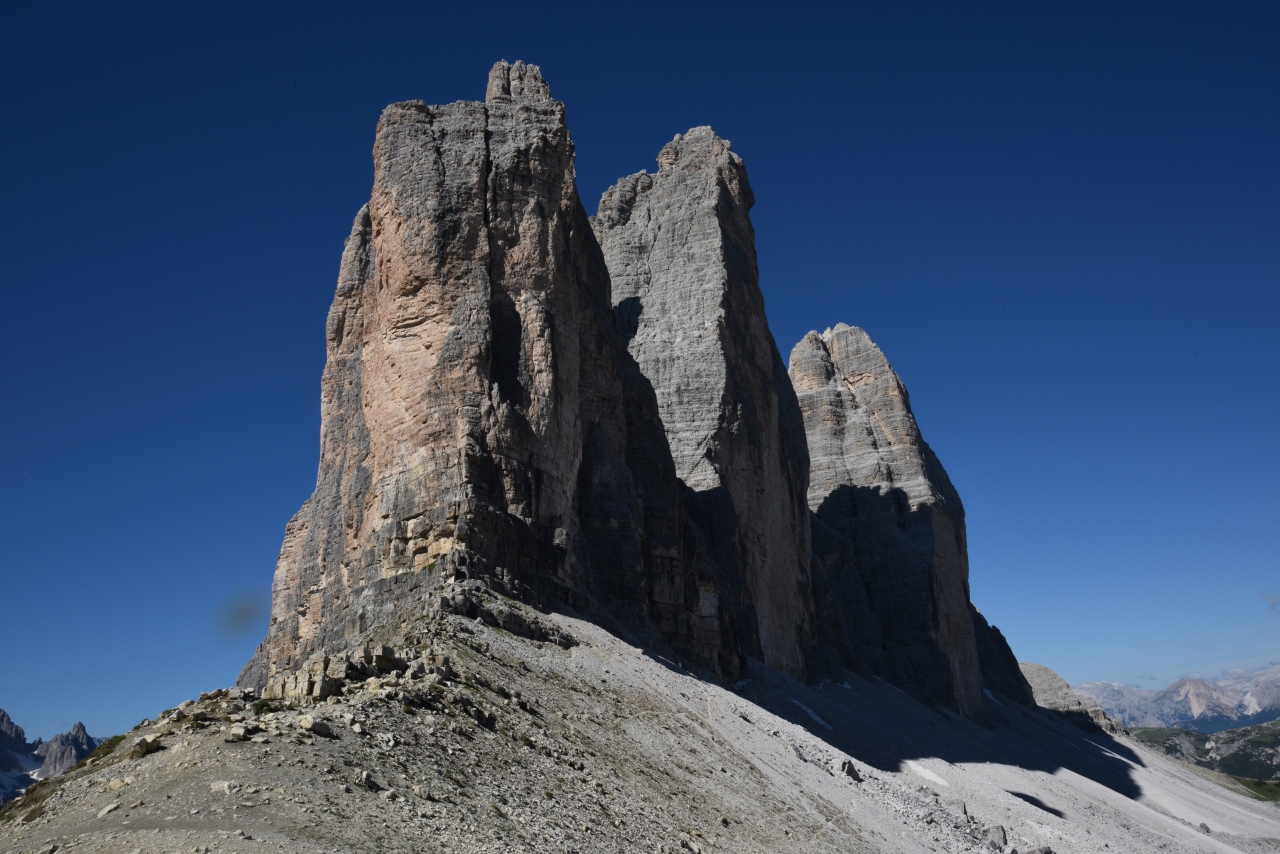 トレチーメ(ドライチンネン)の3つの岩峰は、晴れていれば素晴らしい絶景です。登山の出発点へのバスは8時半過ぎが始発です。これに乗って行くと9時45分ごろに歩き出せます。もうかなりの人混みでした。ところが、次の日、8時15分にバス停でタクシーをつかまえて(70ユーロ)早めに着き8時45分ごろに歩き出したら、登山者はパラパラといる程度でした。1時間の差が大きいのです。