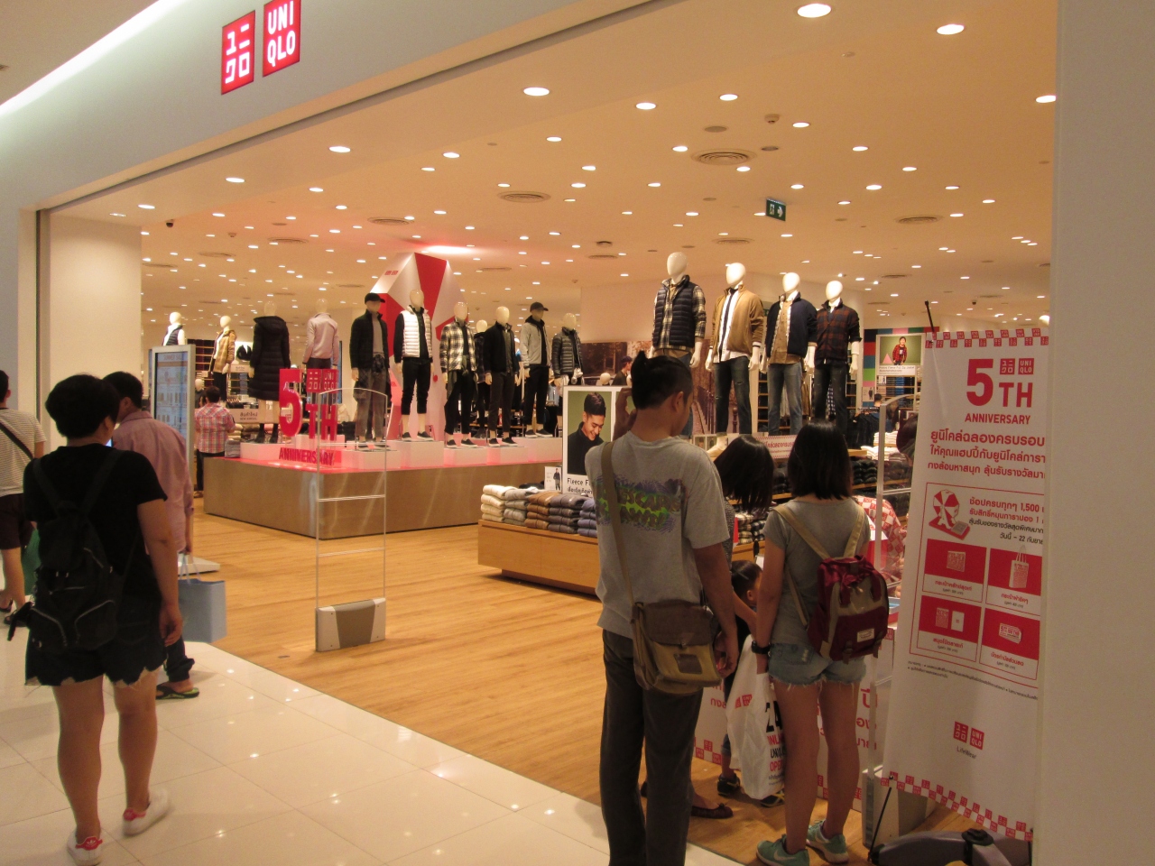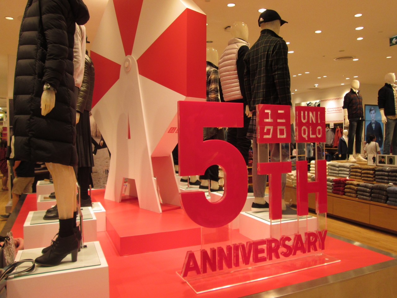 2011年にタイに進出して以来、タイ国内に20店舗以上を展開するユニクロが、9月12日、5周年を祝うイベントが開催されていました。エントランス付近では5周年を記念して、抽選器が置かれ福引きを行っていました。