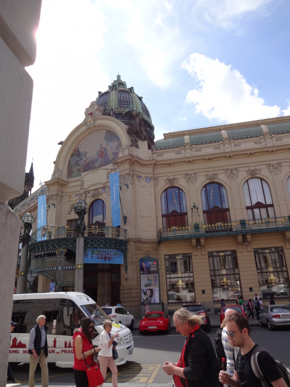 市民会館 Obecní důmは見事なアール・ヌーヴォー様式で、チェコ出身の建築家や芸術家たちによって造られたそうだ。中でも、ムハが手がけた市長の間がすばらしく、ステンドグラスや神秘的な天井画、刺繍が施されたカーテンなど、素晴らしい空間を作り出していた。また、「プラハの春」国際音楽祭の会場となるスメタナ・ホールもこの中にあった。
