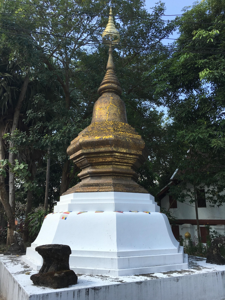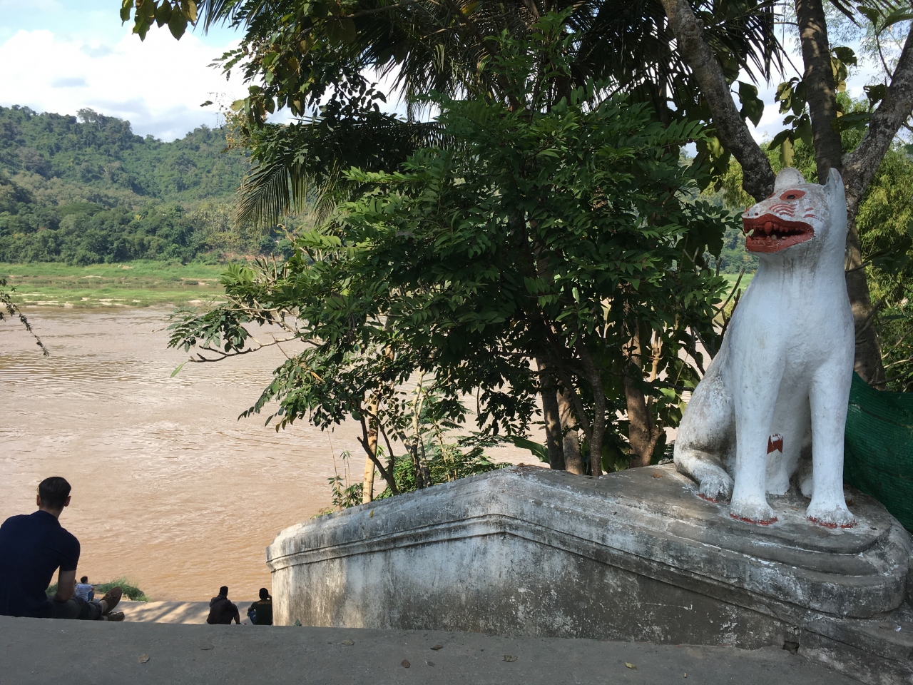 ルアンパバーン北東部、メコン川とナムカーン川の合流地点近くにあるお寺です。町の中心部からは歩いて10分もあればたどり着けると思います。入口には白い狛犬が立っているのですぐ分かります。