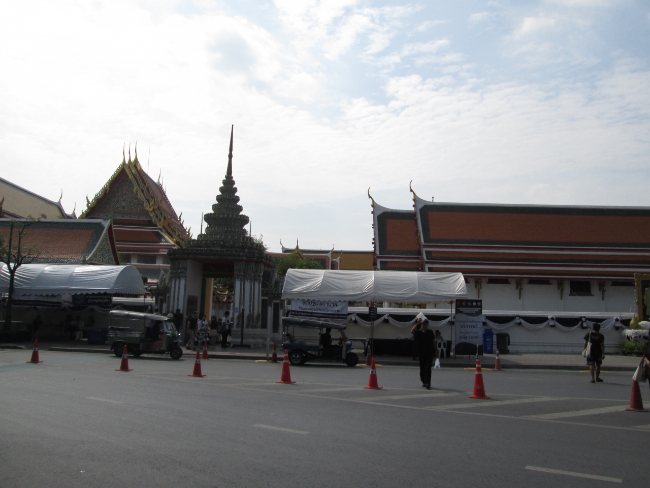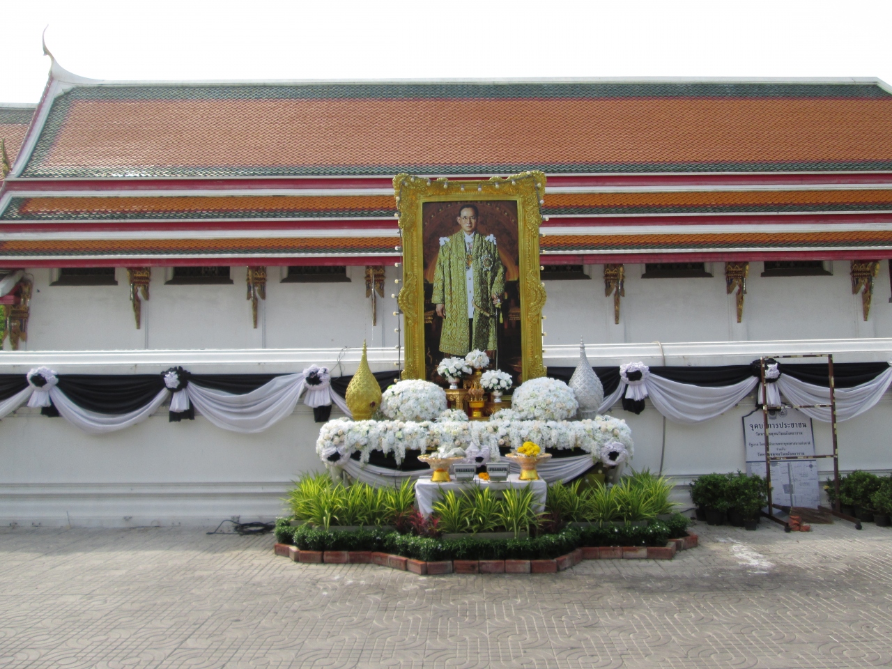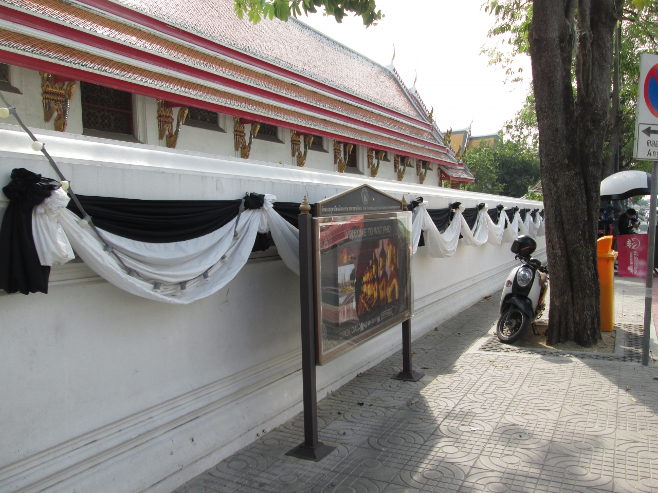 プミポン国王のご逝去に際して、街にはいつも以上に王様の写真を掲げているのが目立ちました。国を挙げての服喪期間となっており、ワットポーのエントランスに王様の写真が飾られており、周囲の壁には服喪中の幕が飾られていました。境内は入場可能で服装の制限はありませんでしたが、やはり、タイ人は黒系の服を着てたり、喪章を付けていました。