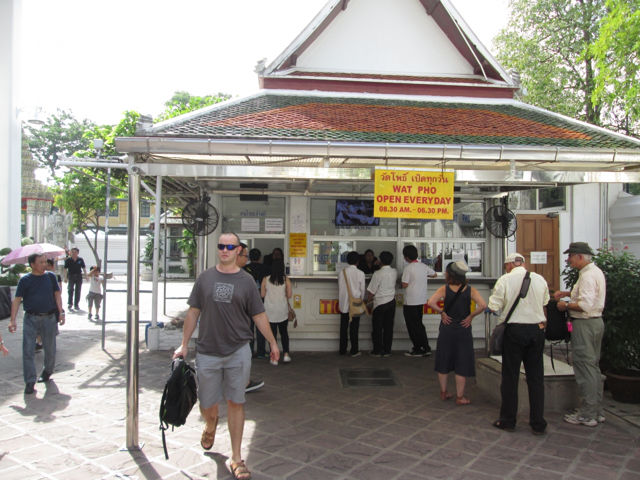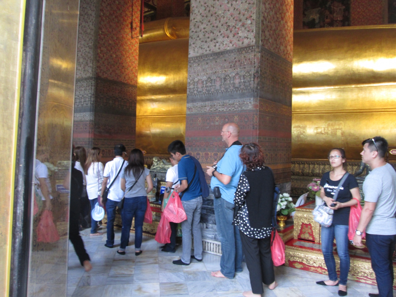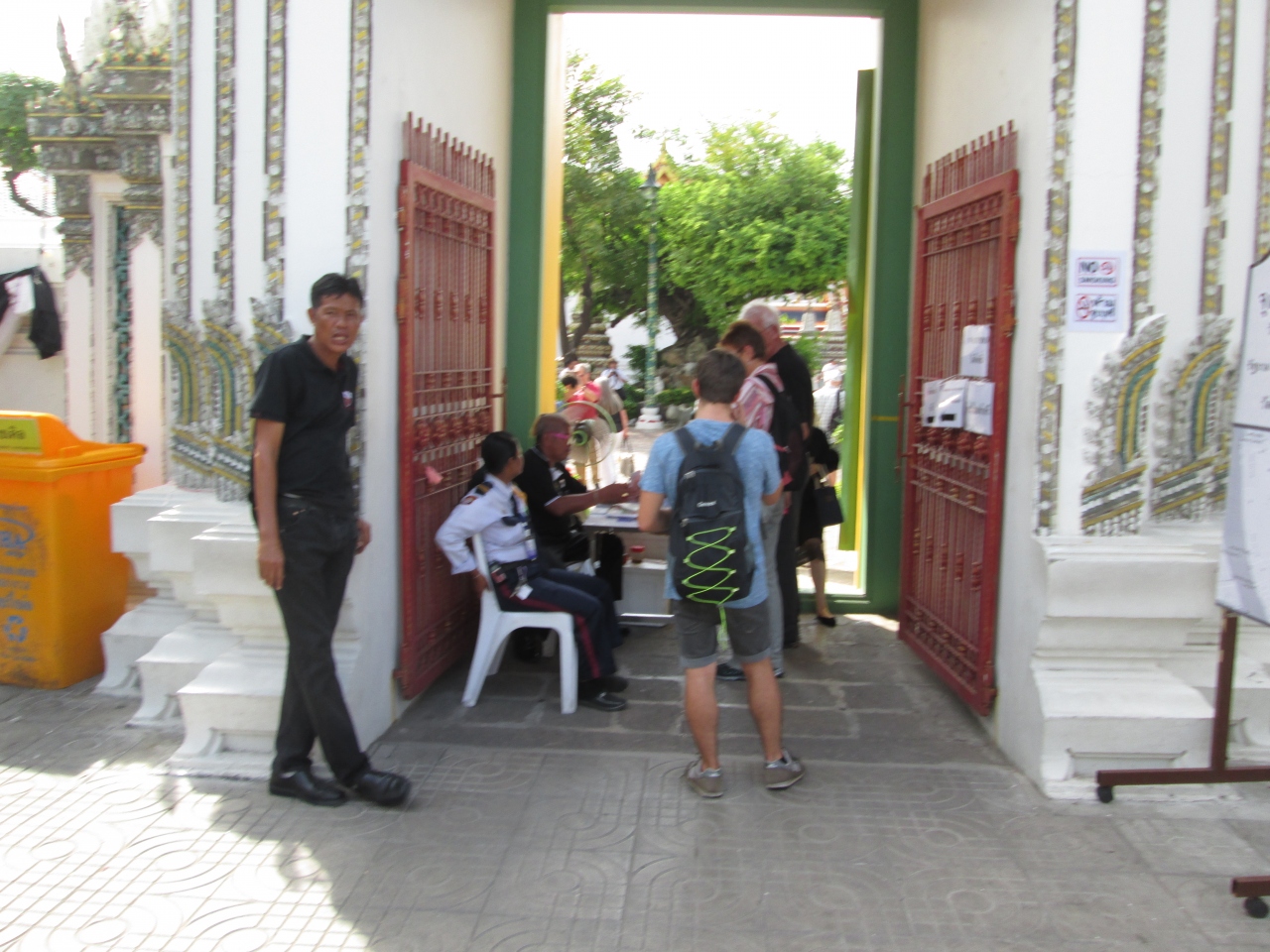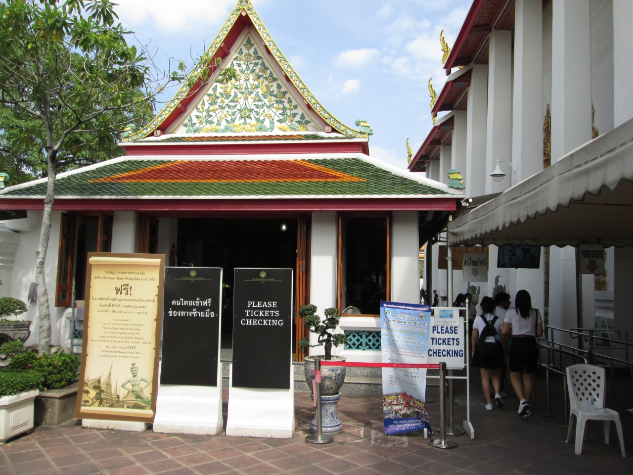 プミポン国王のご逝去に際して、街にはいつも以上に王様の写真を掲げているのが目立ちました。国を挙げての服喪期間となっており、ワットポーのエントランスに王様の写真が飾られており、周囲の壁には服喪中の幕が飾られていました。境内は入場可能で服装の制限はありませんでしたが、やはり、タイ人は黒系の服を着てたり、喪章を付けていました。