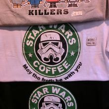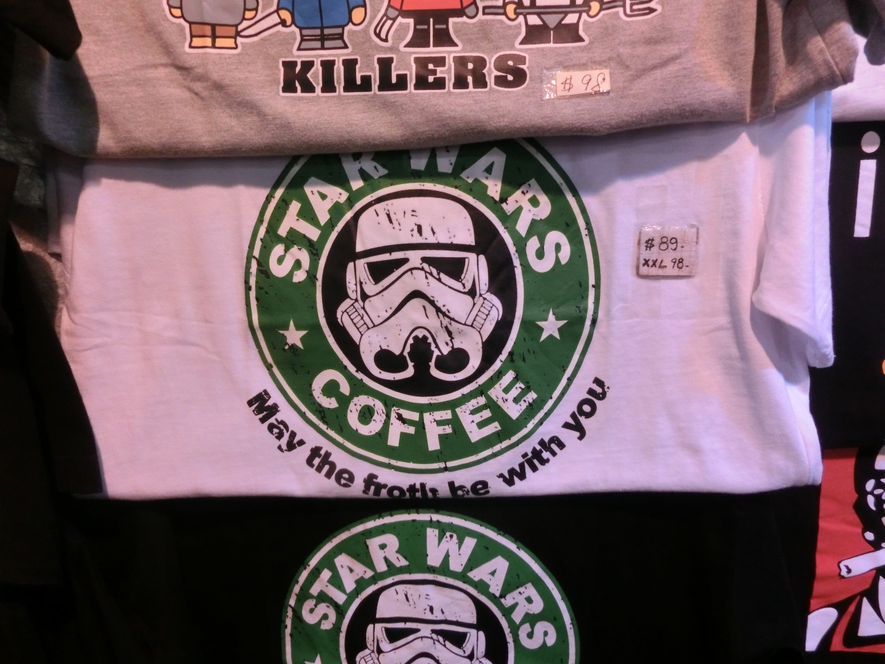 夜に歩き回りました。ごちゃごちゃして歩くのが大変でしたが、STAR WARSのTシャツ、なんだかよくわからないプレートなどなど面白いものが多くありました。香港のナイトマーケットを歩いていて思ったのですが、STAR WARSのものがとても多いです。ダースベイダーやマスターヨーダなんかの置物、STAR BACKS COFFEEをもじってSTAR WARS COFFEEとなっていて真ん中にストームトルーパーのかぶりものが描いてあったりです。
