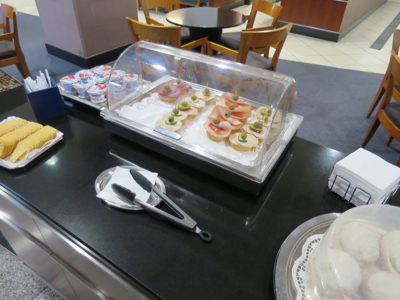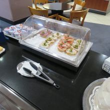 料理は、ポークウィンナー、サンドイッチ、ブルスケッタ、パンケーキ、ヨーグルト、トマトスープなど軽食がある。ここのポテチはなんだかおいしい。ウィンナーもなんか何度も食べてしまったので、そこそこいける。