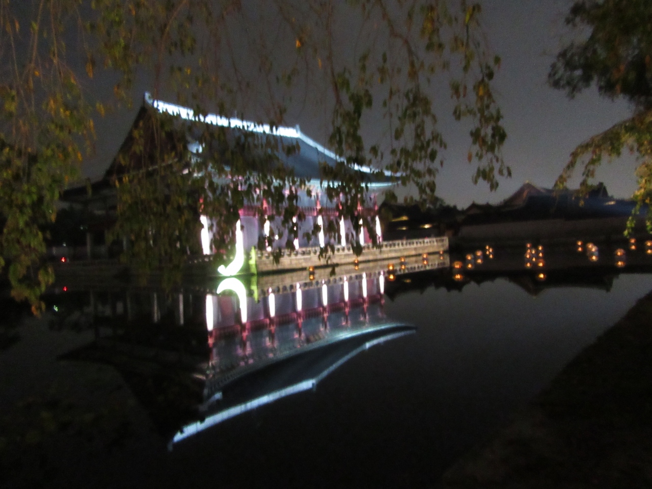 景福宮内の香園池に張り出した建物で、宴席が営まれていた場所らしいです。毎年そうなのかは分かりませんが、私が行った夜間開放の時にはイベントとして映像が投影され、舞踊があってました。スクリーンが掛けてある姿を見た時は、修復工事中かと一瞬思ったのですが。