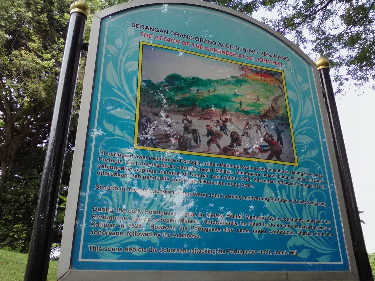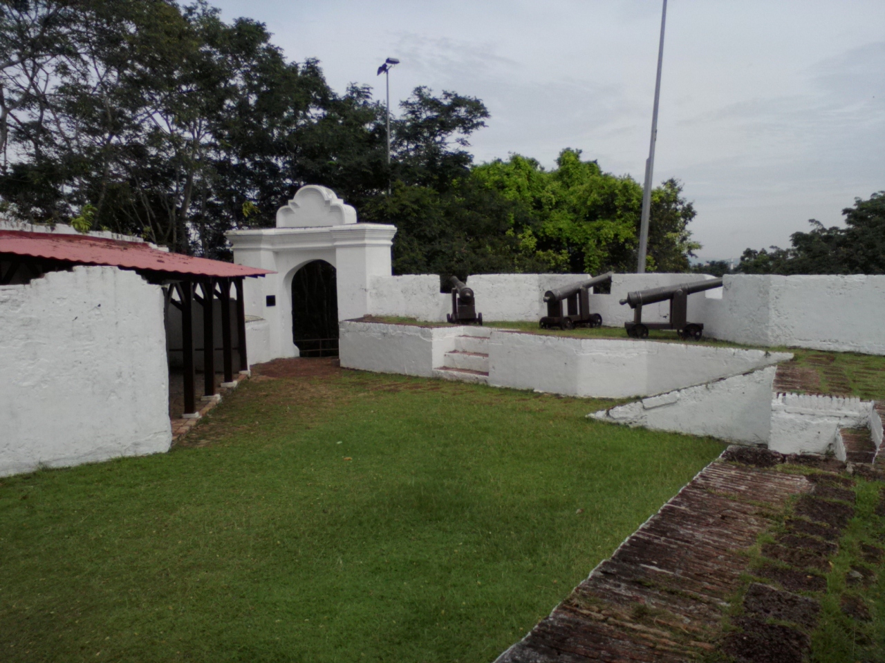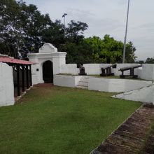 丘の上にある要塞跡。要塞北側から木々に囲まれた道路を進んでいくと駐車場がありその先に白い壁の砦が見えます。そして階段を登ります。途中には当時の戦いの様子が描かれた絵がありますが朽ち果てていて一部の物しかみられません。頂上の砦には当時オランダ軍が設置した大砲が数門残されていますが規模はかなり小さめ。大砲は本物?レプリカ?どっちなんでしょう。砦からはマラッカ市街と海が見渡せ気持ちのいい場所ではあります。見学無料です。