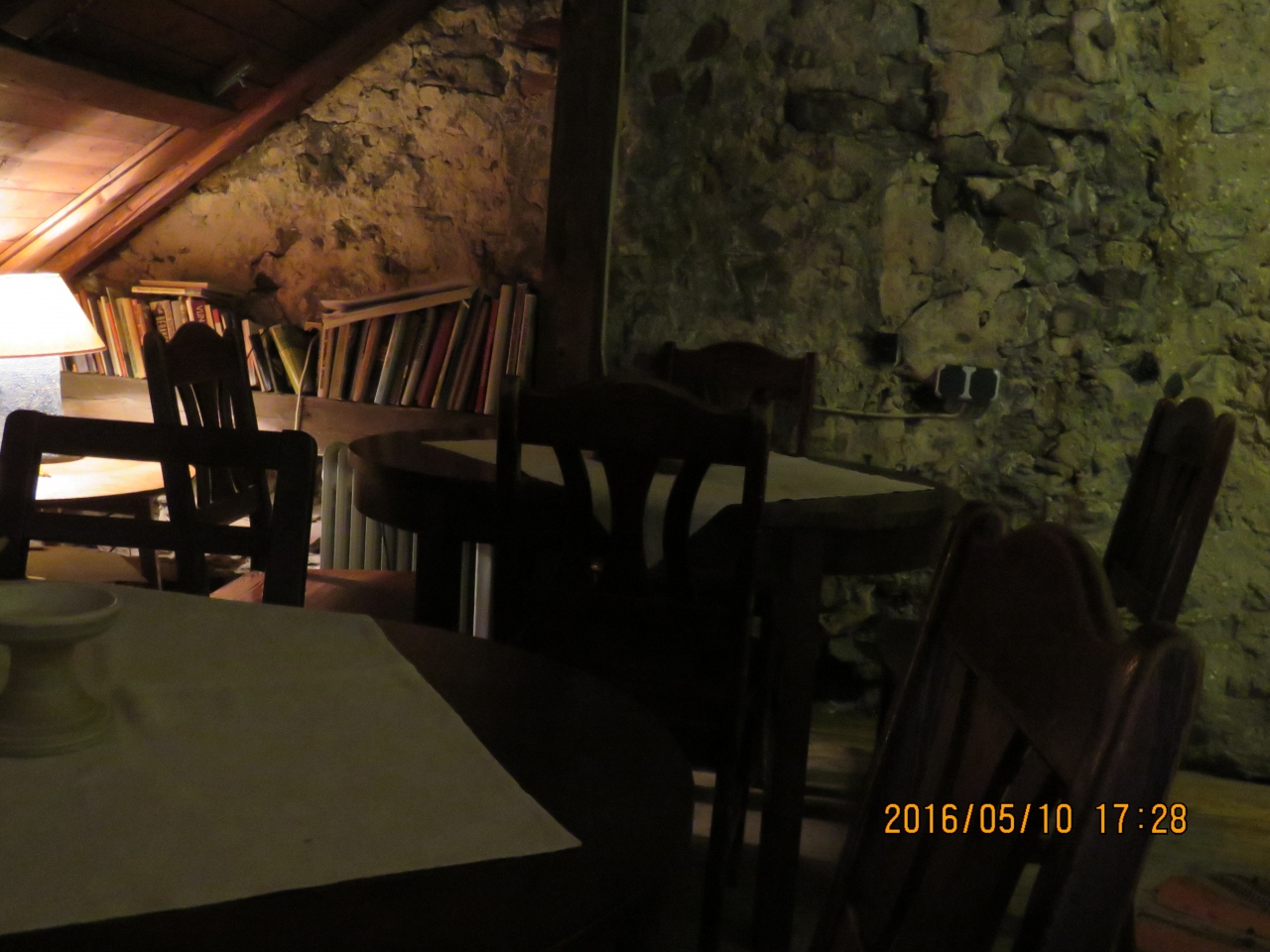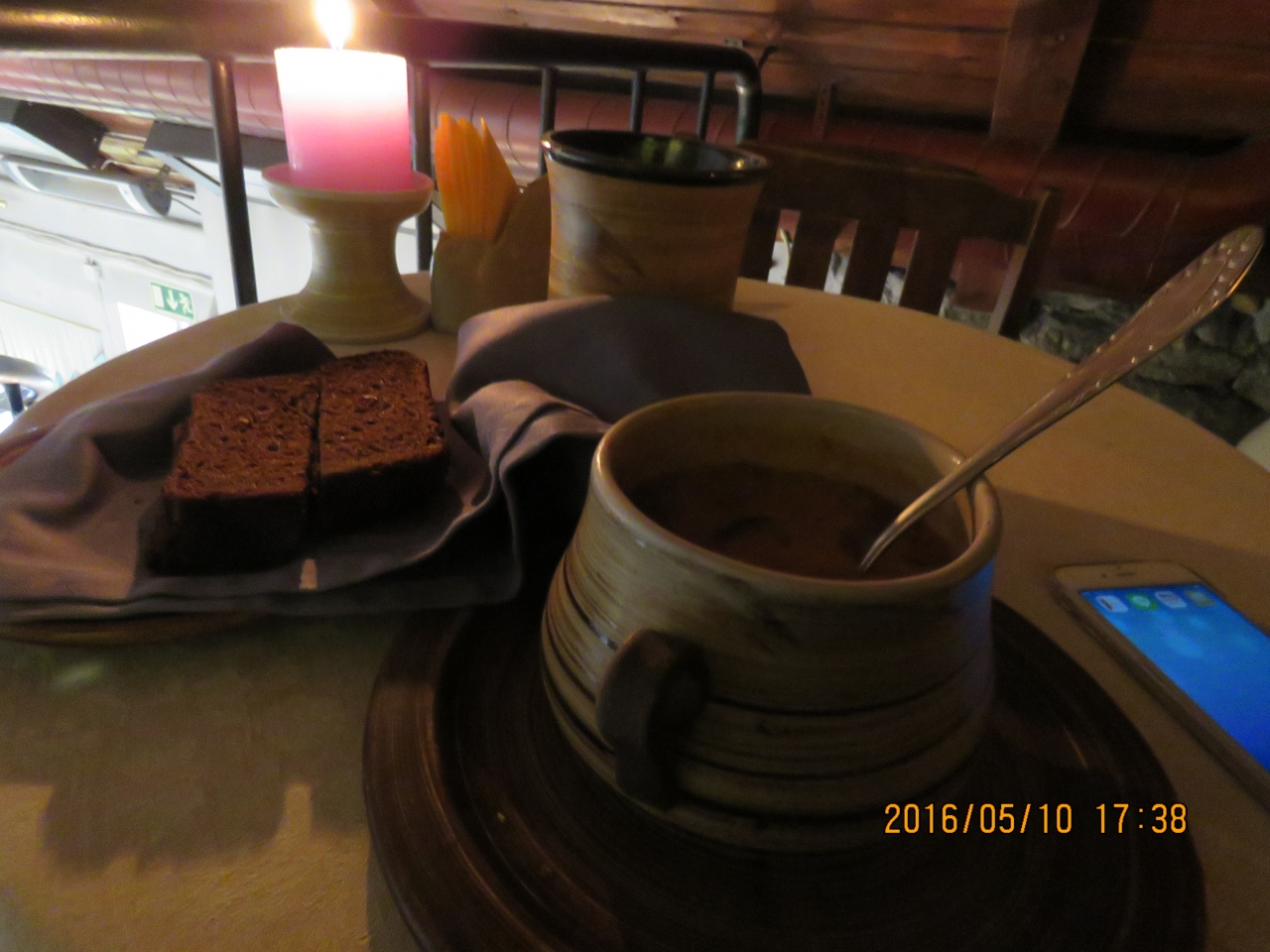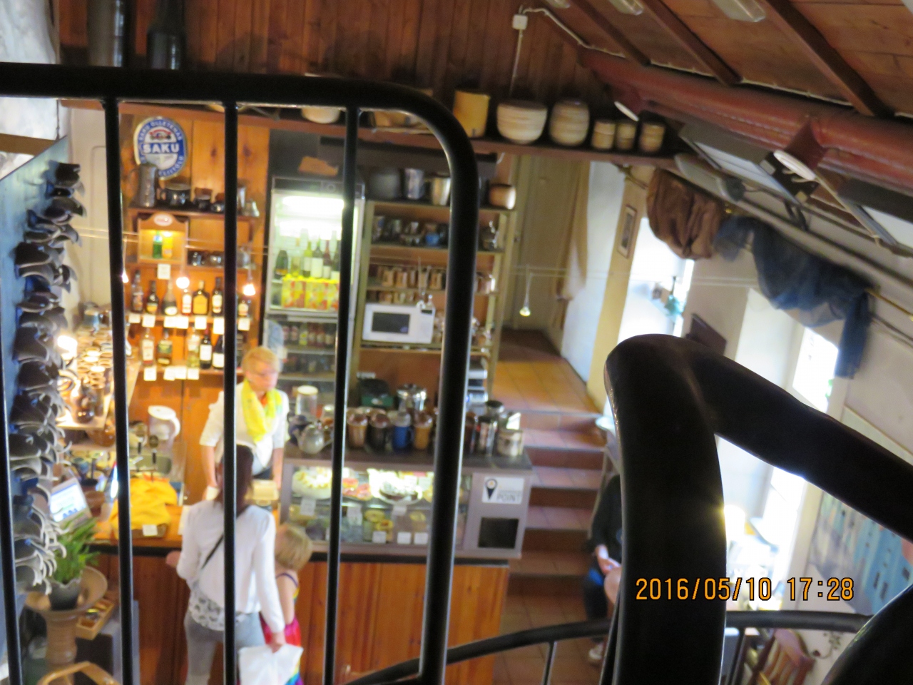 レジにいた女性に、「ここで注文するんですか?」と尋ねたら、「席ででもどちらでもいいですよ。席は2階にもありますよ」とメニューを手渡されたので、その場でセリヤンカスープとネスティを注文し、2階席に上がりました。中世的な穴倉のような2階席は少しひんやりとして一息つけました。