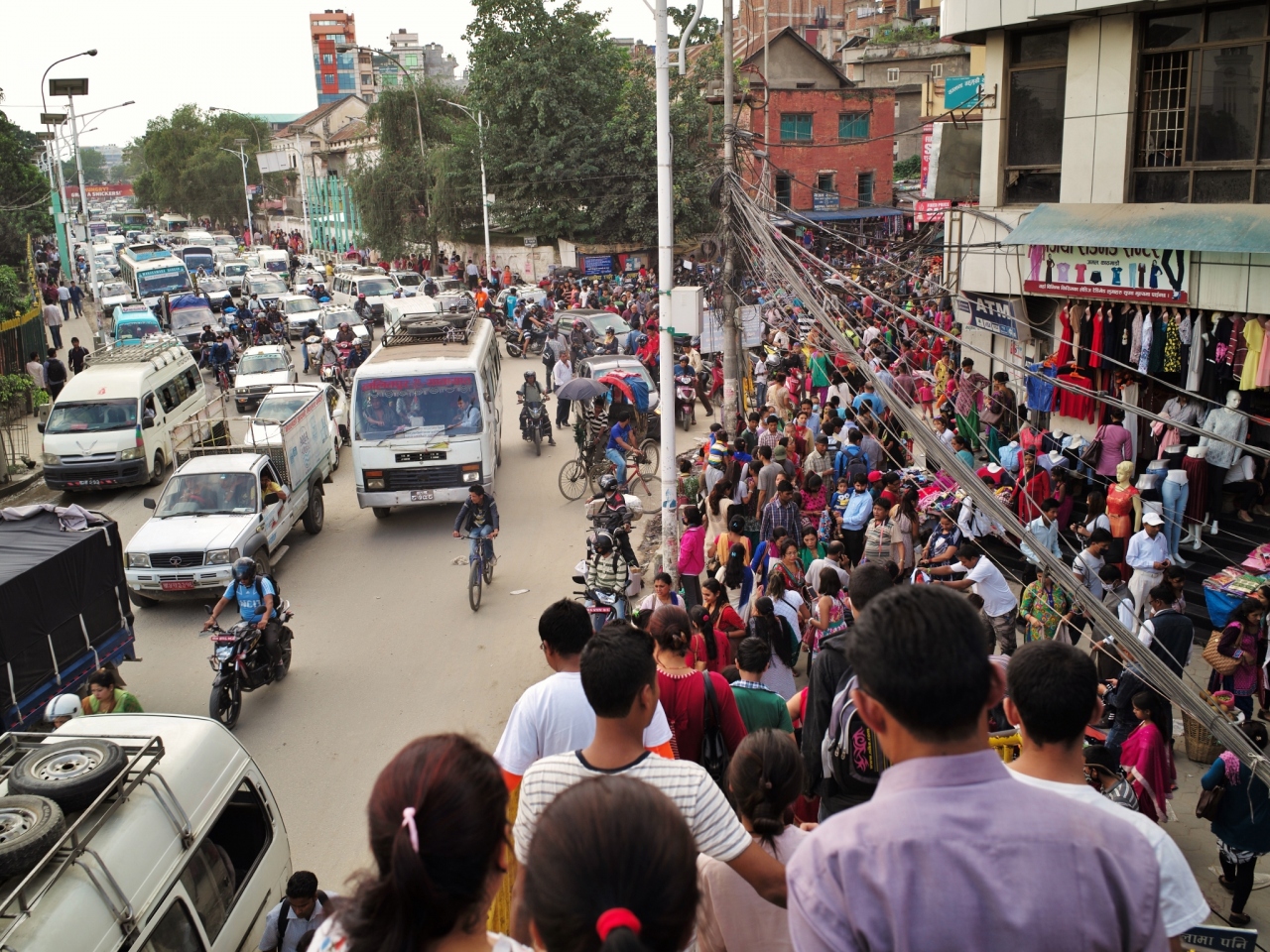 とても道路を横断できるような交通量ではないので、ネパールの人も仕方なく歩道橋を渡っていましたが、アサン・チョークの方へ向かう橋や階段は人通りが多い上に歩道橋の上に店を開いている露天商がいるので大混雑、渡るのにひと苦労しました。