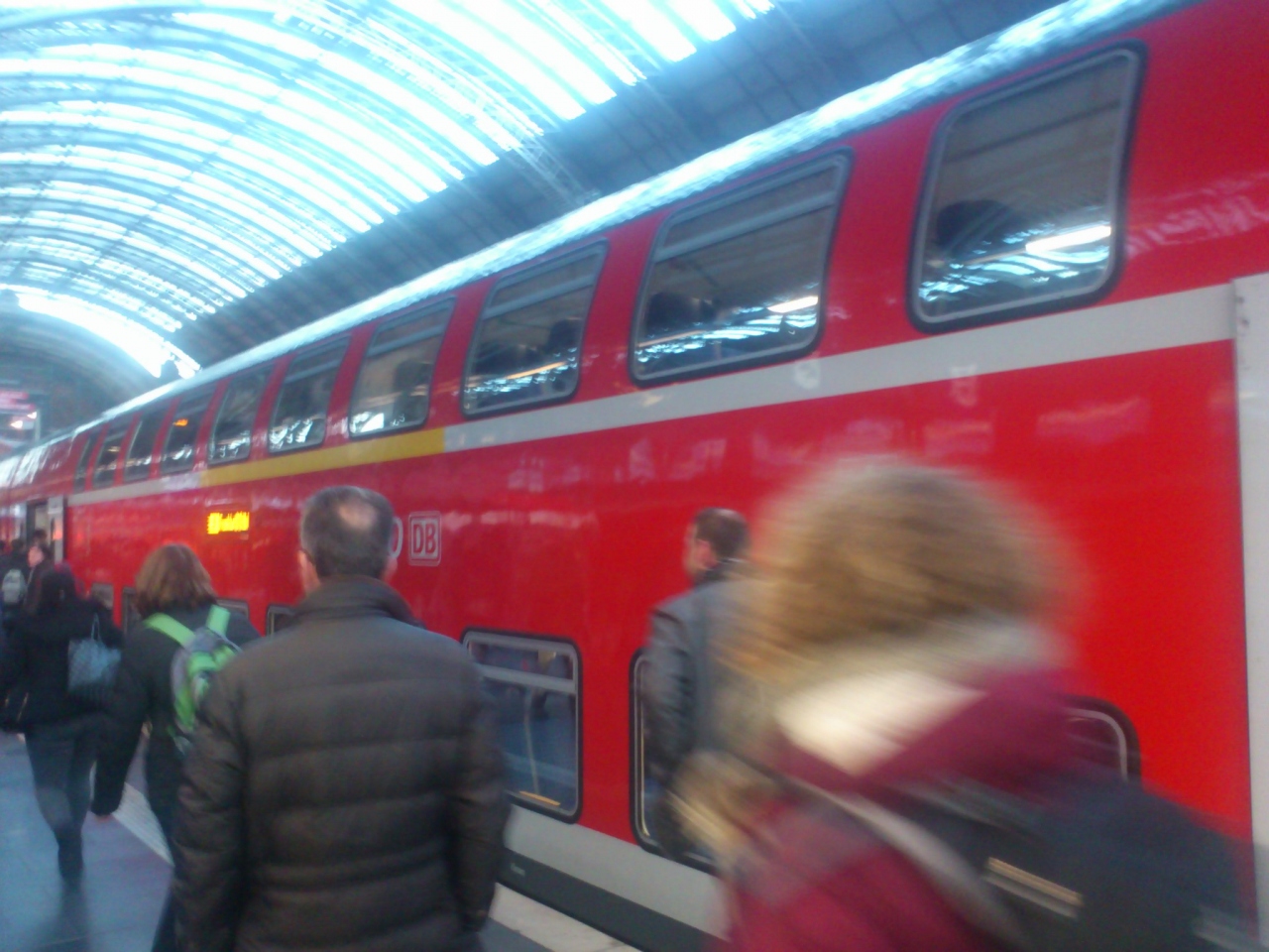 郊外の小さな駅から2駅ほど、フランクフルト中央駅まで電車で移動しました。ドイツで普通電車に乗るのは初めてでしたので、少しドキドキしましたが、赤い色の立派な電車が来て安心しました。約8ユーロでした。乗り心地も良くて、これならドイツの移動は電車でも良いかもしれません。