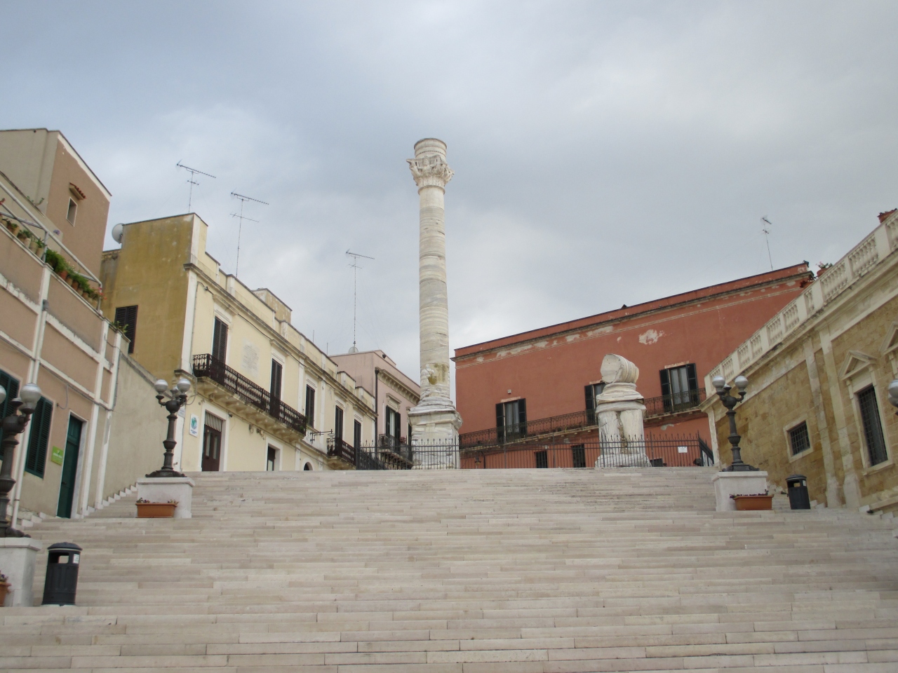 海沿いの広場の急な階段の上にあるアッピア街道の終点を表す円柱です。高さ18.74mで、8つの大理石を重ねた姿は「女王の道」にふさわしいたたずまいです。海沿いの道を歩いていると、見えてきます。白い塔は海沿いにふさわしいです。