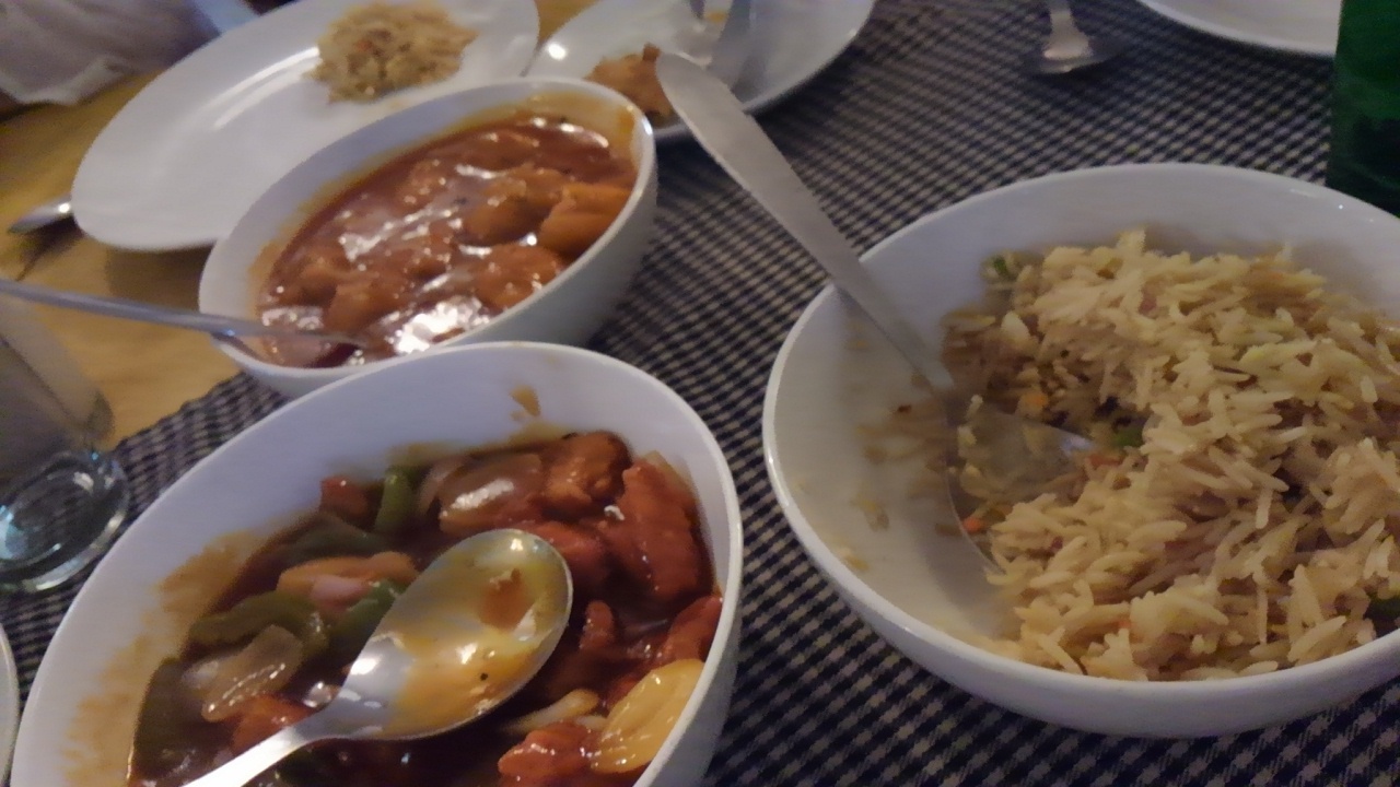 ツアーでインド風中華料理をいただきました。あくまでもインド風でしたが春巻きや、酢豚、チャーハン、焼きそば等はインド料理に飽きたら良いですね。私たちはいただきませんでしたが、席の後ろがブッフェコーナーになっていてカレーも並んでいました。