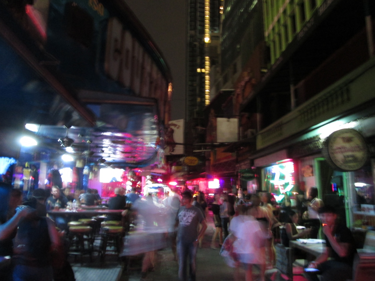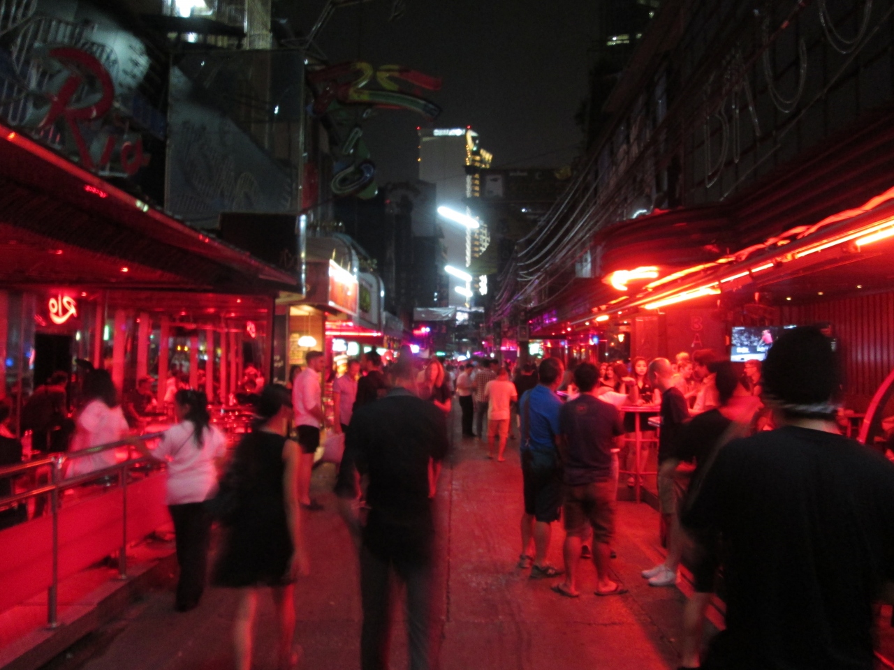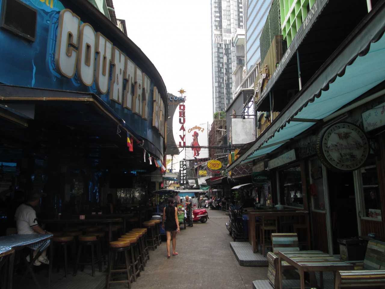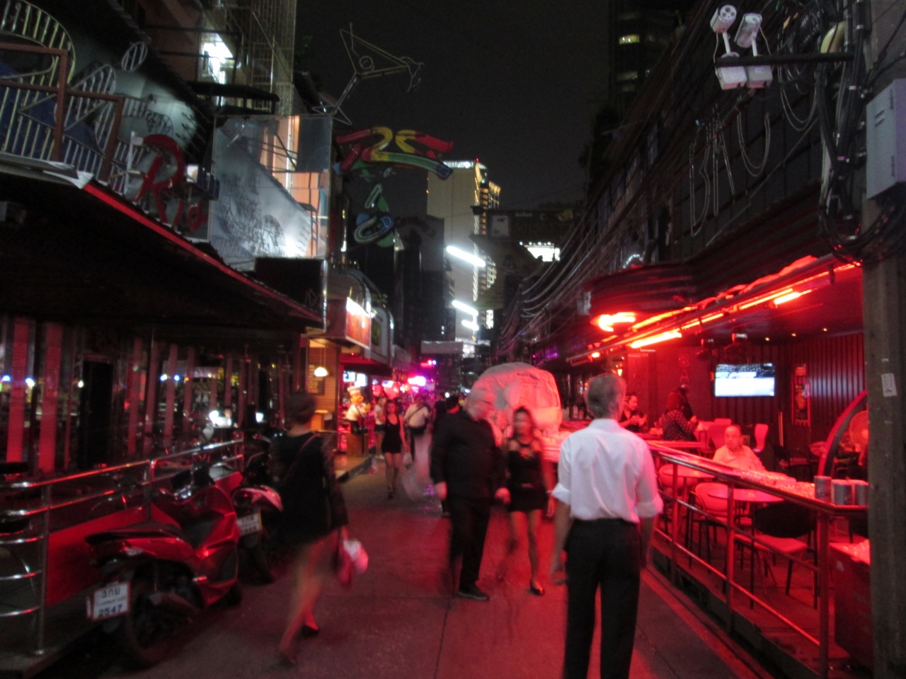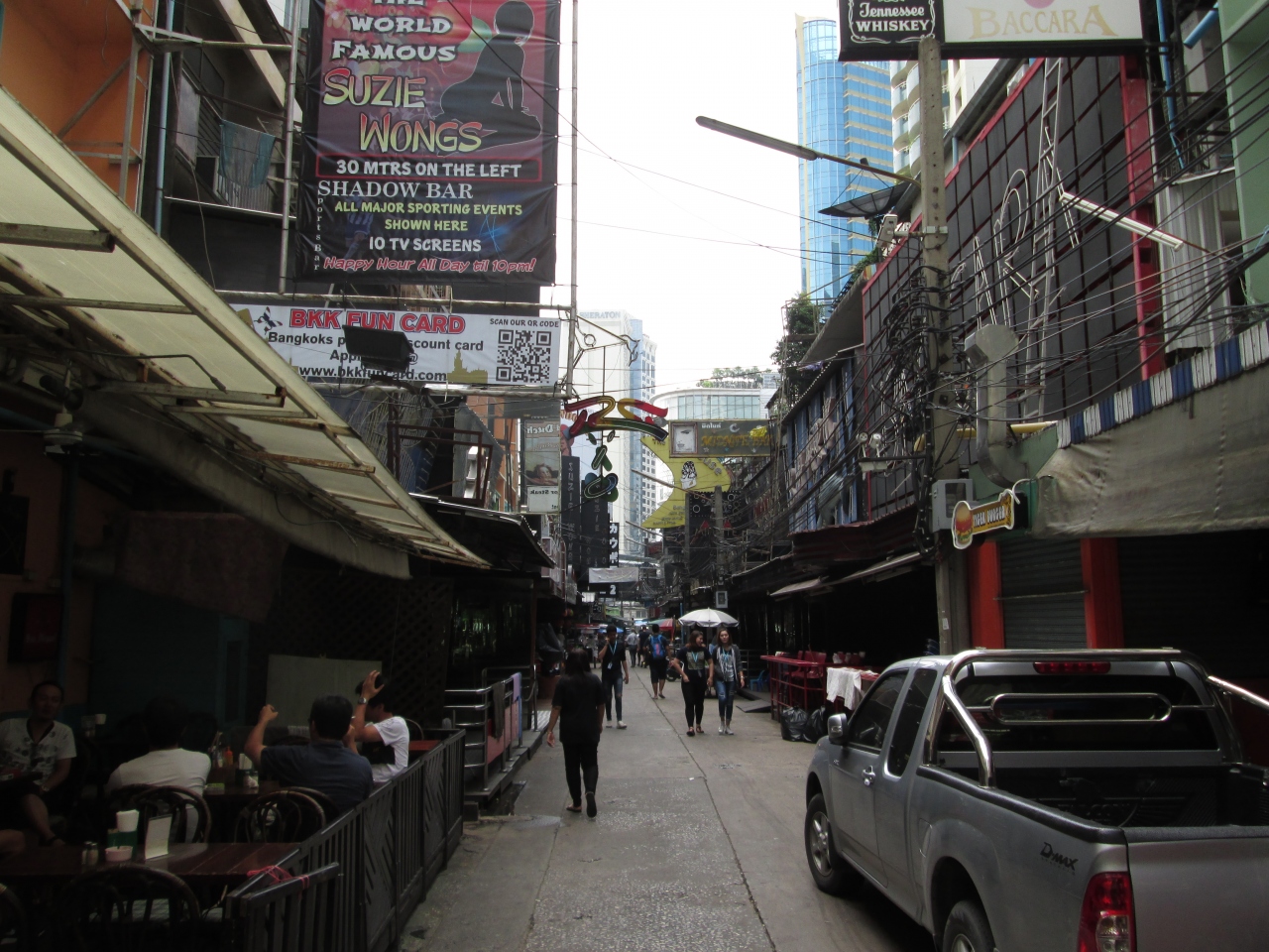 プミポン国王のご逝去に際して、国を挙げての服喪期間となっていますが、日中は通りのバーは通常営業しており、午前中からでもお酒が飲めます。移動式の屋台も出ていつもの風景でした。通常、夜になると煌々と明かりがつき、うるさいぐらいの音楽が流れますが、自粛のためか明かりは落として営業していました。