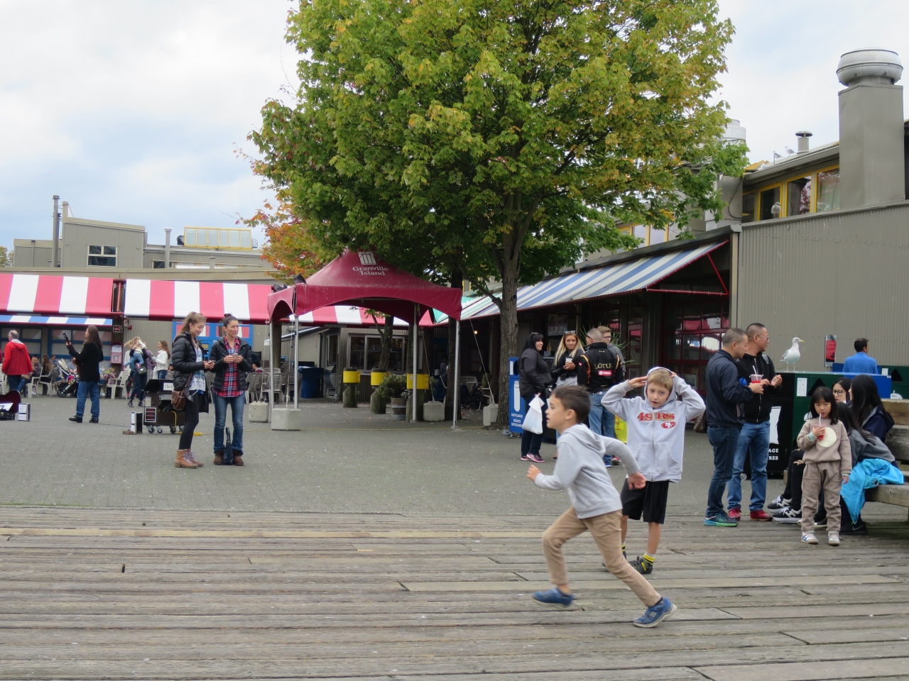 パブリック・マーケットの川沿いにはちょっとしたスペースがあり、フォールス川対岸のダウンタウンのビル群を眺めながらのんびりと時間を過ごすのに最適です。一通り見学を終えたら、そこからアクアバスに乗って、対岸のイェールタウンに行くことをお勧めします。