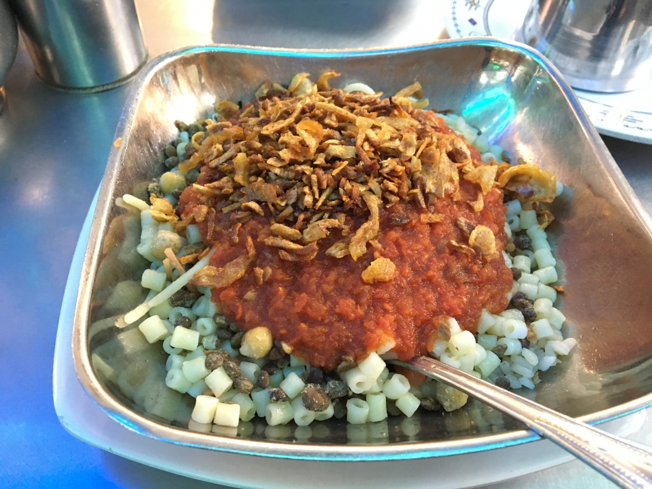 2種のパスタをベースにトマトソースというかミートソースのようなものをかけ、玉ねぎフライなどのトッピングを混ぜていただきます。カイロ駐在の方が進めてくれました。初めていただきましたが美味かったです。日本でもお店を出せばそこそこはやりそうな感じでした。食後にライスプディングを進められて食べました。甘い牛乳かけご飯という感じで若干違和感はぬぐえませんでした。広い店内には地元の方も多く、値段も安いのでお勧めです。