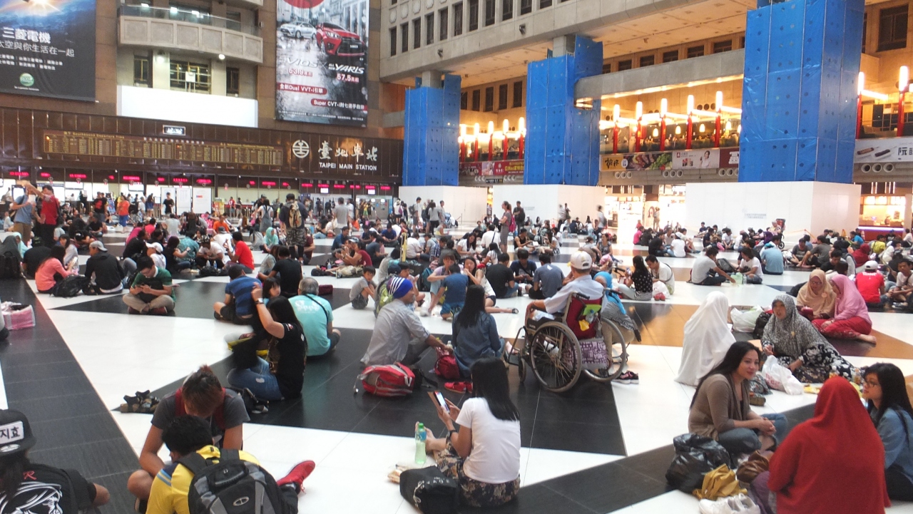 また、駅舎中央の吹き抜けスペースでは、地べたに座って、台湾へ出稼ぎに来ている人や、学生など、東南アジアからの人々がいたるところでプチ・パーティを開催中。