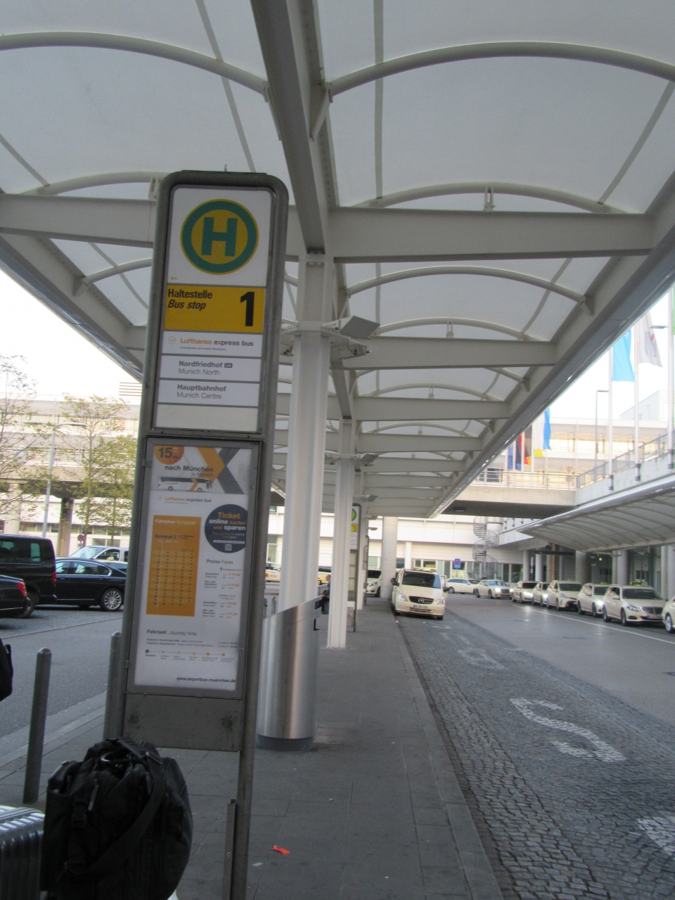 ミュンヘン国際空港のバス乗り場は到着ロビーを出て右に曲がりまっすぐ歩いて外に出ます。外に出てすぐの1番乗り場がエアポートバス乗り場です。バスの看板も出ているので迷うことはありません。