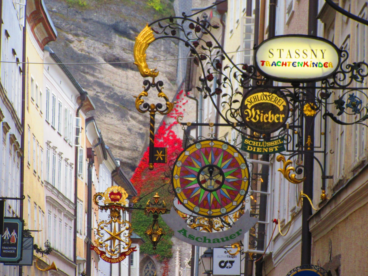 道幅は狭く、観光客も多いので歩きづらいですが、中世の趣を残す通り沿いには、ファッション店や宝石店、飲食店など多くのお店が並んでいます。どの店も手の込んだ美しい鉄細工の看板が設置され、お店に入らなくても看板を見ているだけでも楽しめます。
