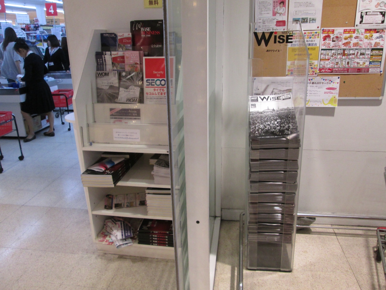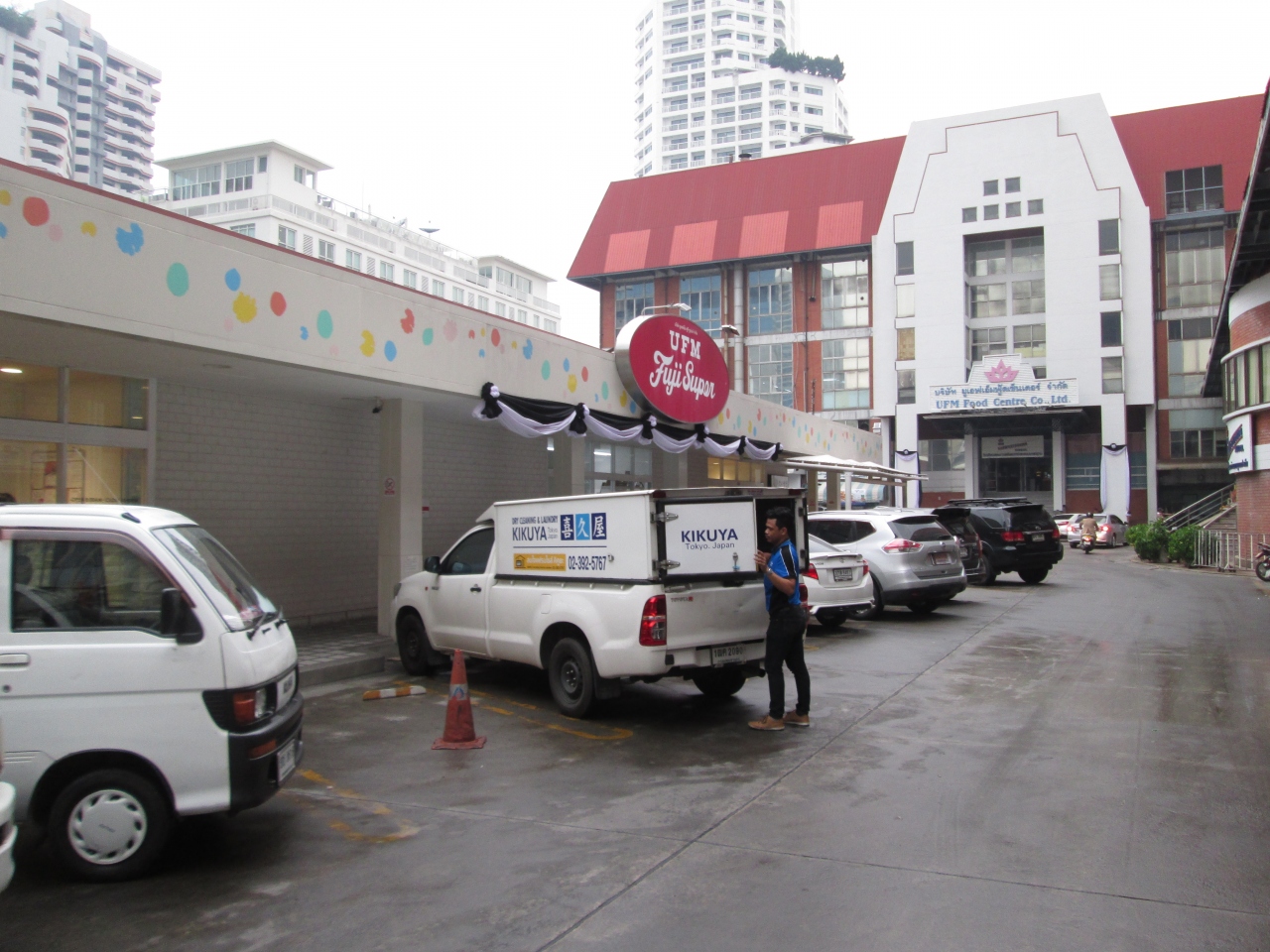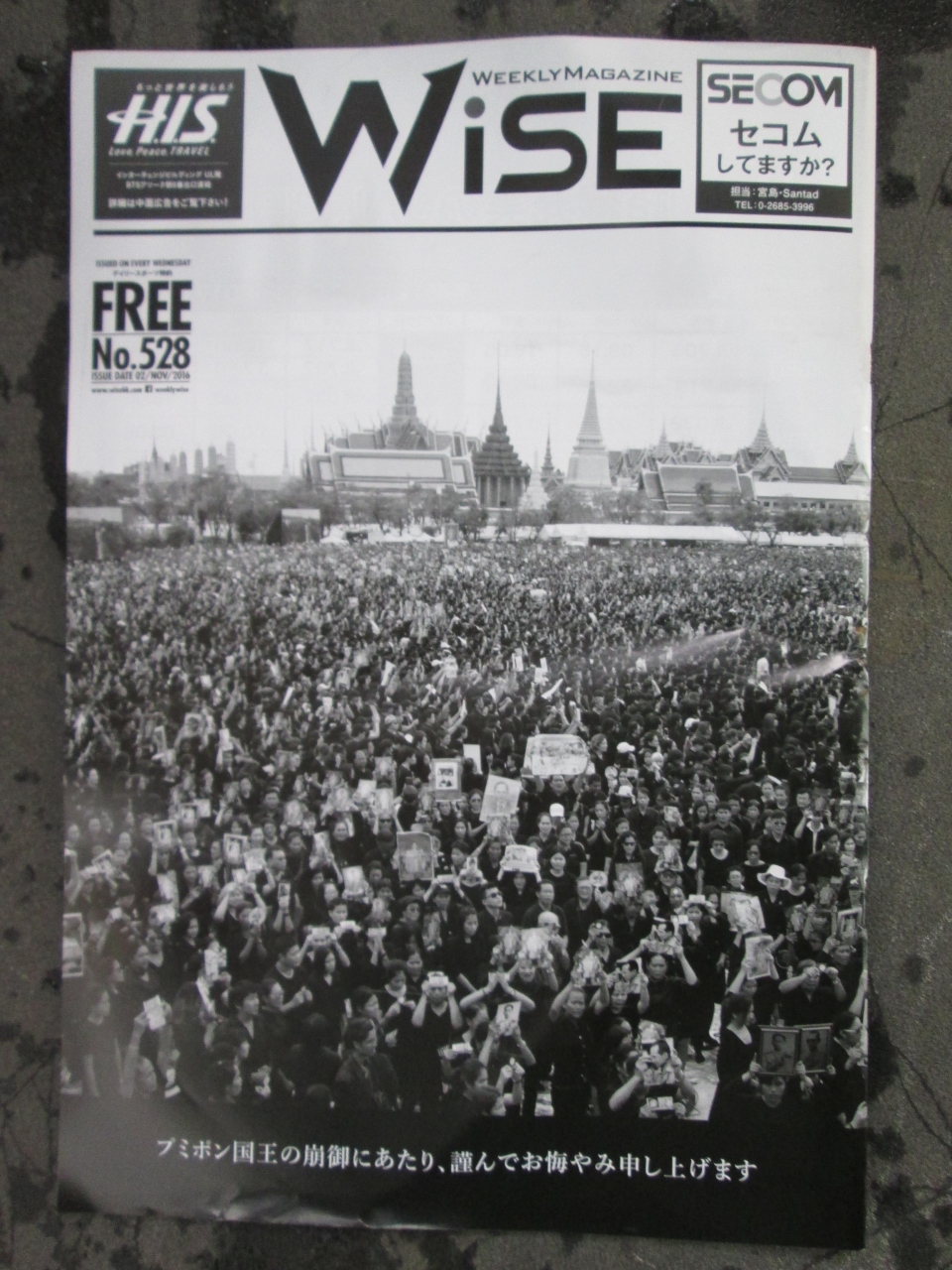 プミポン国王のご逝去に際して、街は国を挙げての服喪期間となっています。国を挙げての服喪期間となっており、フジスーパーのエントランスには服喪中の幕が飾られていました。お店自体は通常営業していましたが、讀賣新聞の係員もオレンジではなく黒系の半被を着用して対応していました。そして、現地情報誌WISEは国王特集でした。