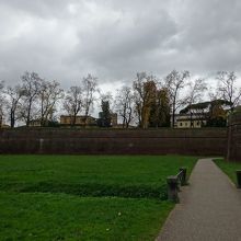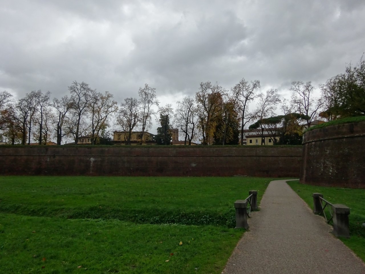 ルッカの旧市街をぐるりと囲む城壁は高いものではなく、小高い丘くらいの高さです。城壁の上に木が植えられておりゆったりした雰囲気です。それでも外側から見るとちゃんと城壁らしく、まわりにお堀のような溝もありました。