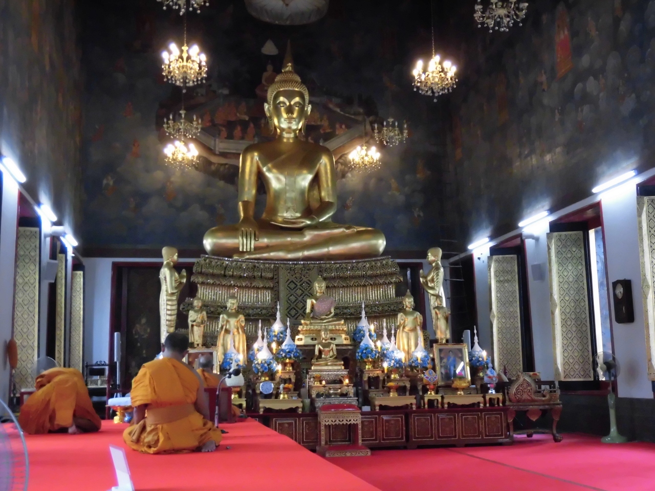 ヨーロッパのお城のような、タイのお寺とは見えない外観です。37本の尖塔を持ち、廊下が回廊状になっています。ただ2016年11月5日現在、外観の修復工事中で、黒色だった屋根の部分を全て金色に塗替え作業中でした。
