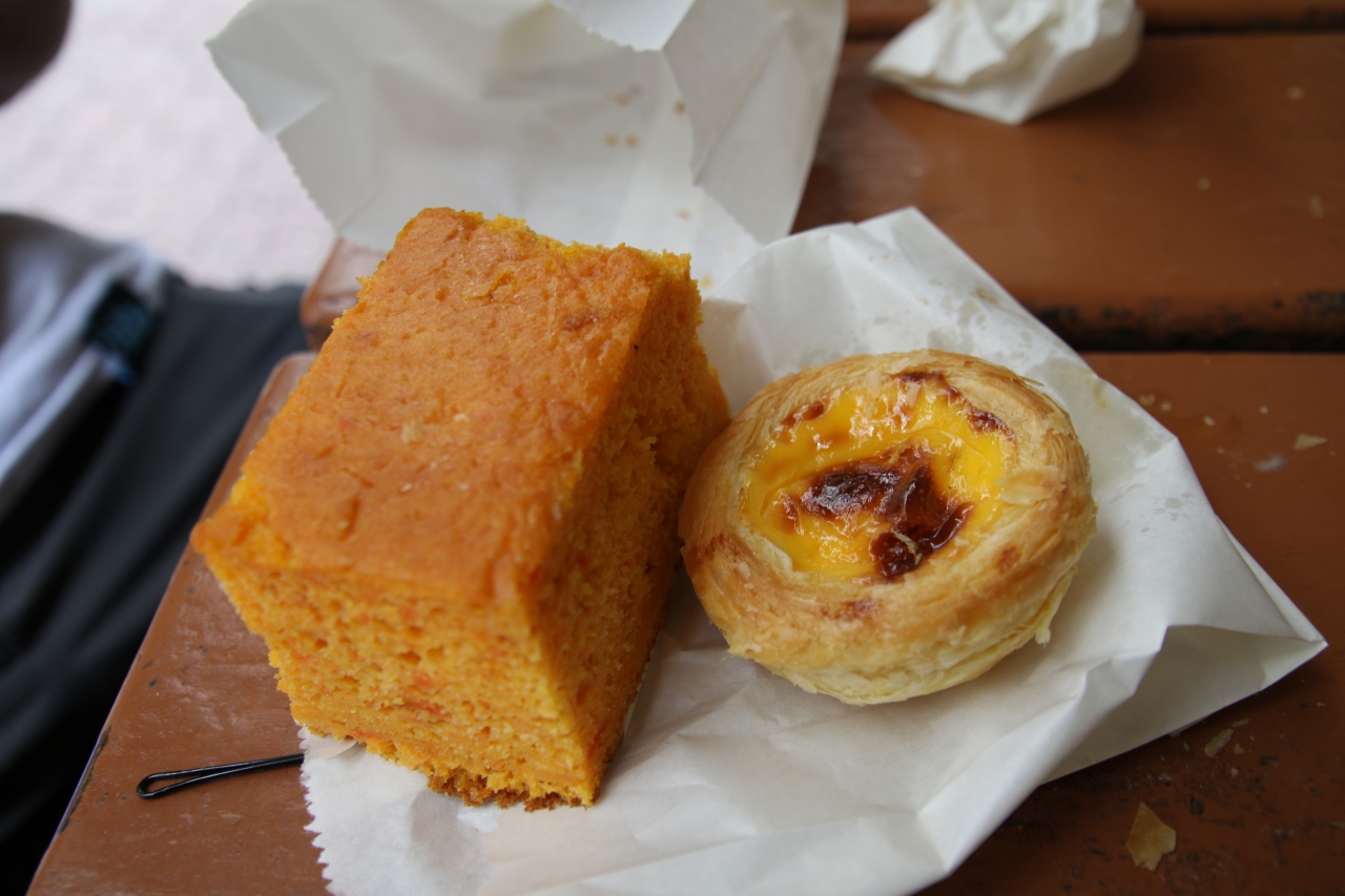 できたてアツアツのエッグタルトは、中身がトロリとして甘さはちょうどよく、卵の風味がいっぱい。ちょっとパイ生地のバターが多いかな…とも思いますが、満足感があります。