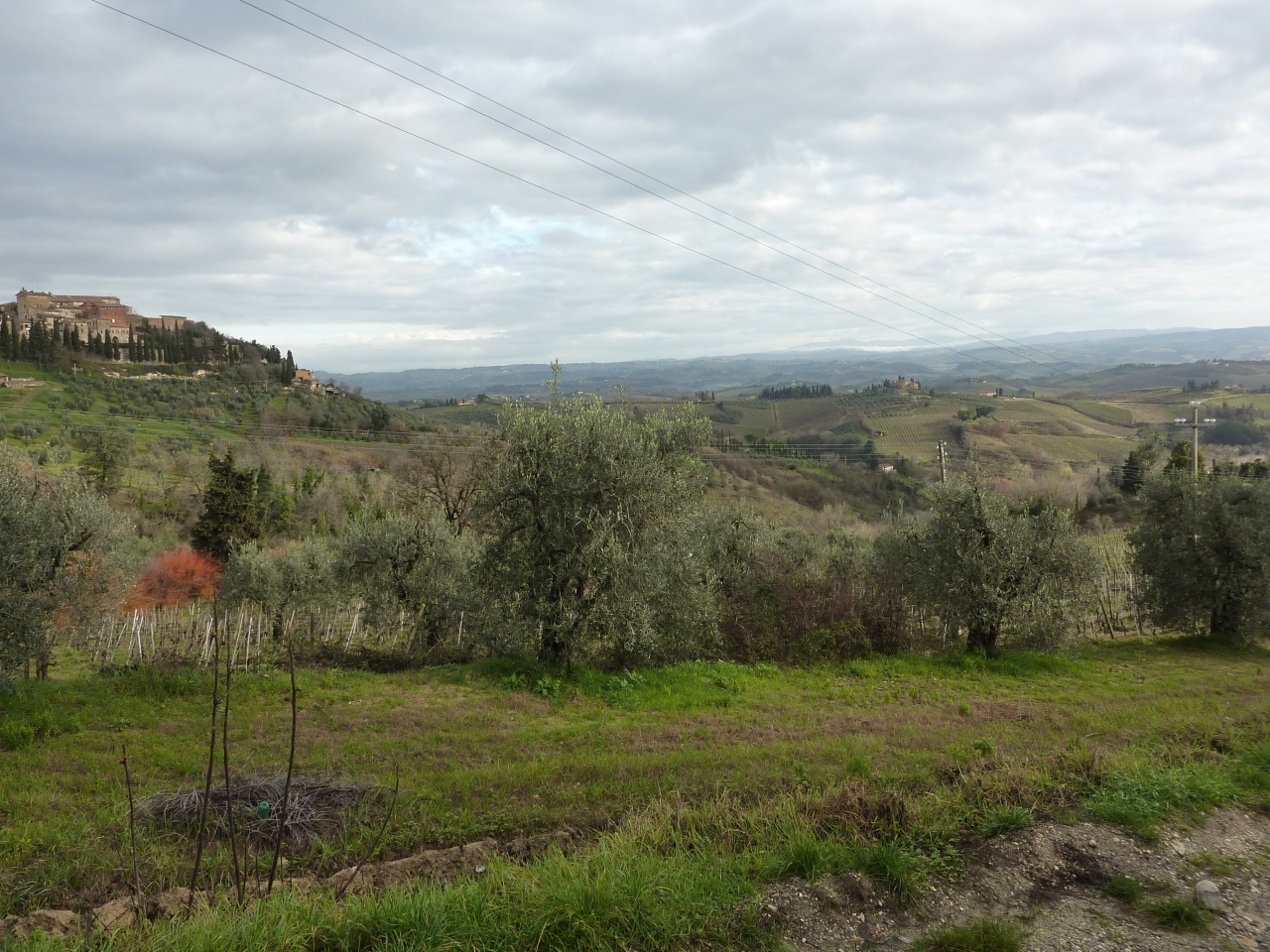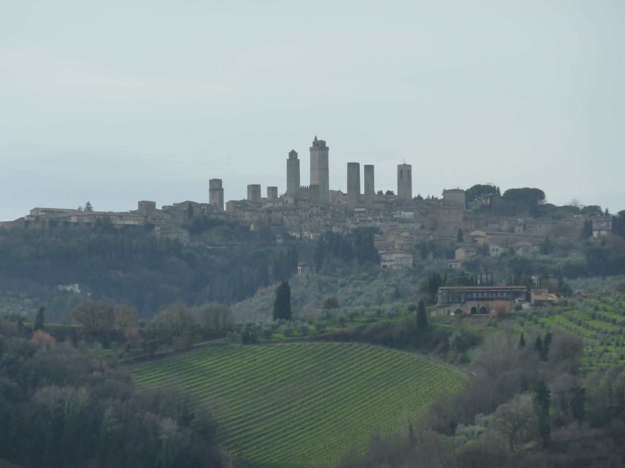 トスカーナの丘の上に城壁に囲まれた塔の街が広がっています。サンジョバンニ門の手前の坂道を下り、石垣が切れる所まで行くと、糸杉の間からオリーブ畑に囲まれたサンジミニァーノの街並みを見る事ができます。塔の街として知られていますが、ここからは数多くの塔を目にすることができます。