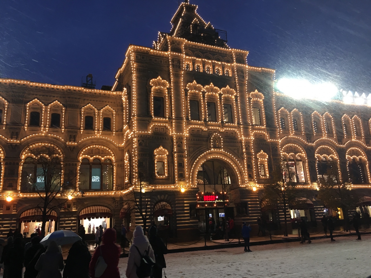 高級店が多く集まる百貨店で、建物も豪華です。飲食店や食料品・お土産品を扱うお店もあります。外観のイルミネーションがとても綺麗なので、特に夜がお勧めです。広さの割にトイレが少なく、帝政ロシア時代のトイレを再現した有料トイレは大行列でした。
