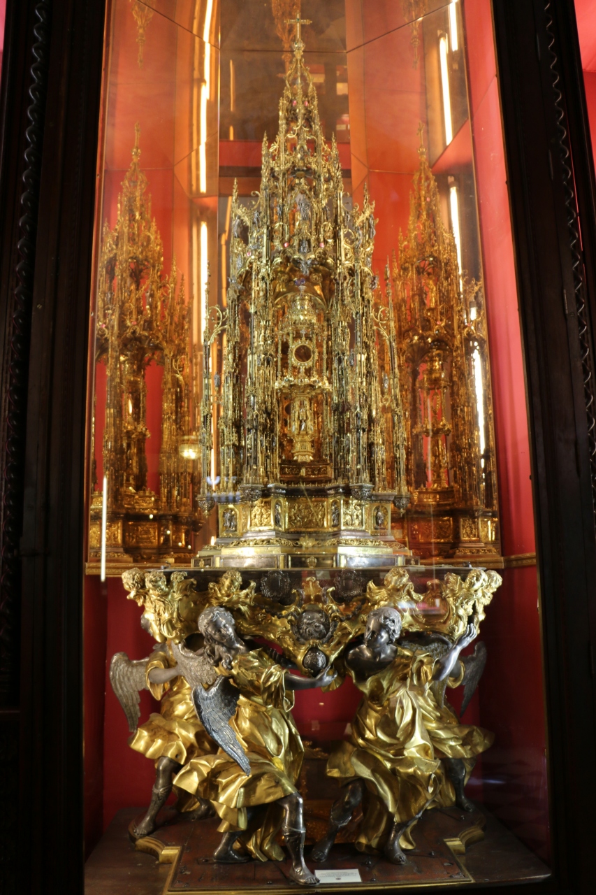 宝物室に置かれた高さ3メートル重さ180キロの聖体顕示台は、総純銀製で金箔が張られており、中央の台は総純金でこちらも必見。