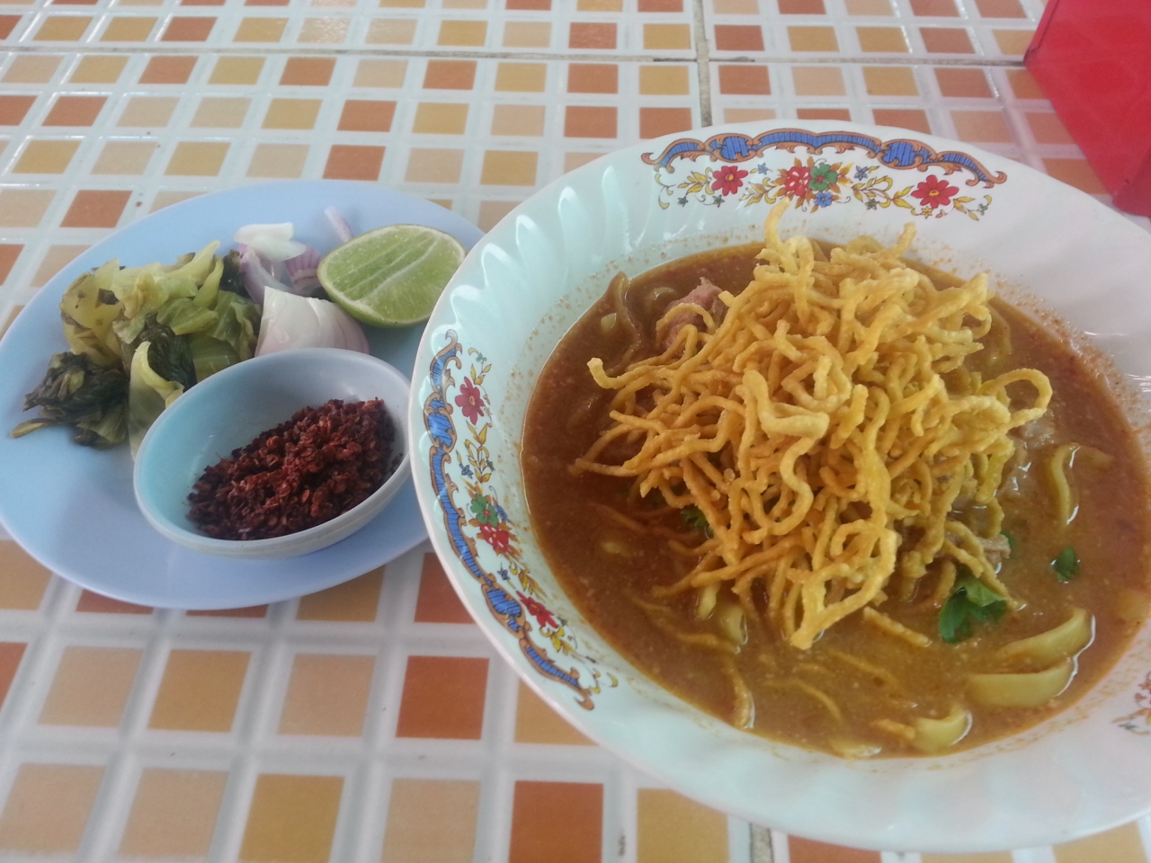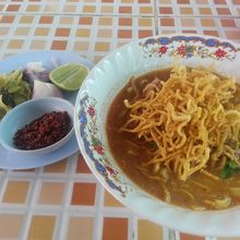 肝心のカオソーイは、まず何といっても安い!そして薬味?もたっぷりつきます。味は結構あっさりで食べやすい。ココナッツミルクの風味はあまり感じられないタイプなので、こってり好きには物足りないかも。辛さは後からやってきます。お店の人も手際よくお客さんをさばいていきます。地元の食堂感が味わえます。
