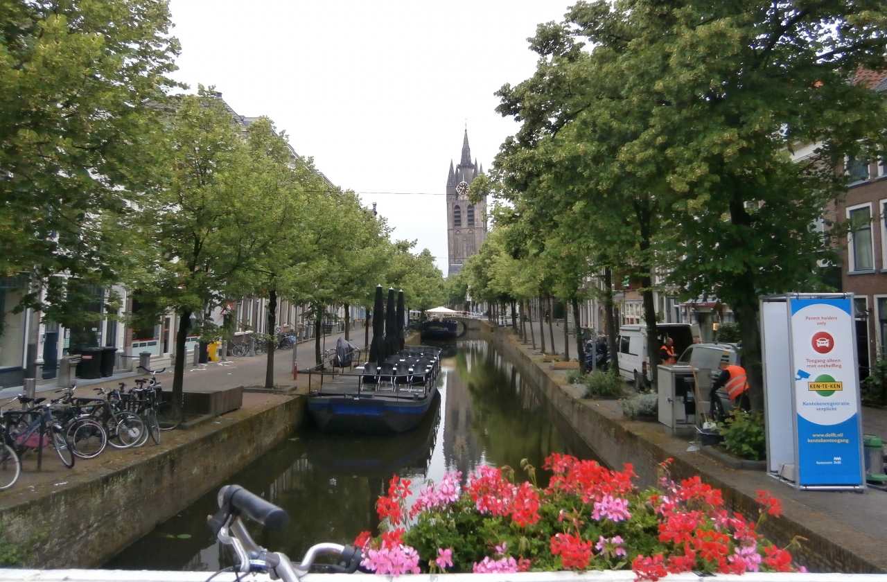 デルフトで最も美しい運河と言われるオウド・デルフトにかかる橋の上から見た、運河の先に旧教会が立つ眺めは最高でした。