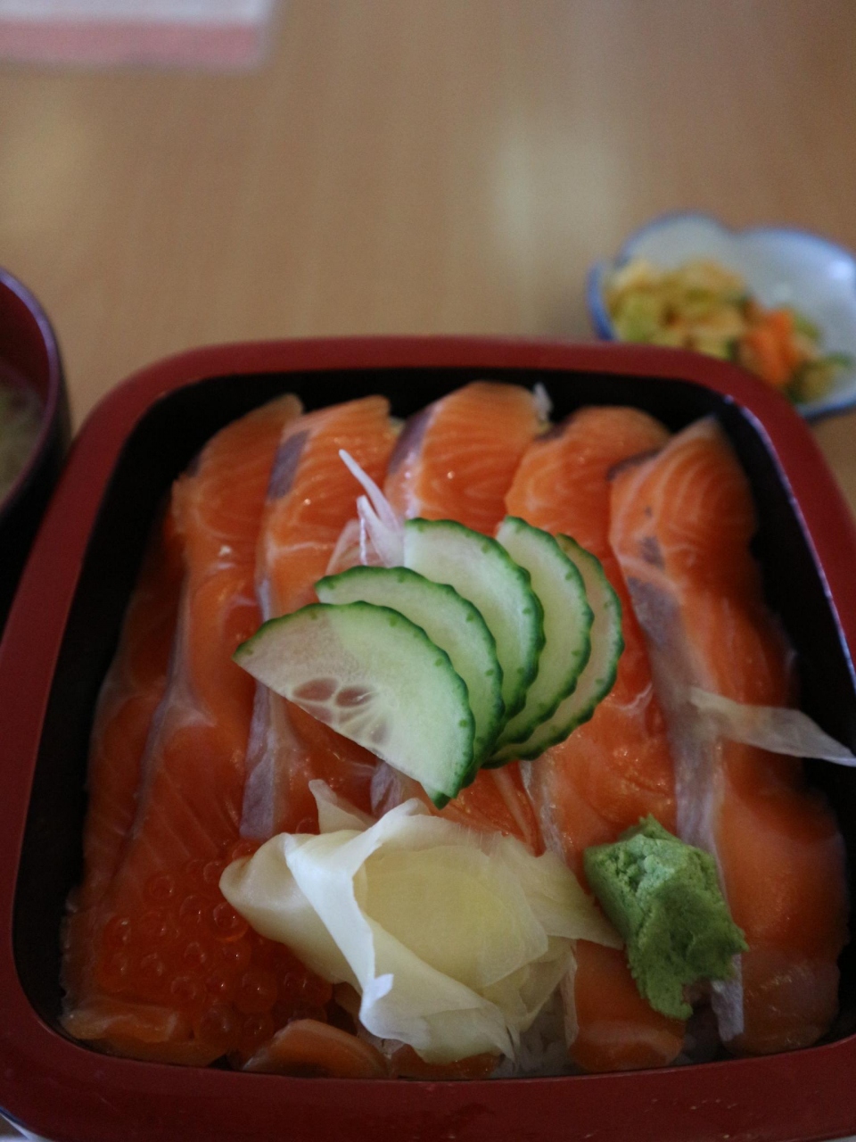 名物のサーモン丼は、上だけでなく酢飯の中にもサイコロ状のサーモンが入ってました。
