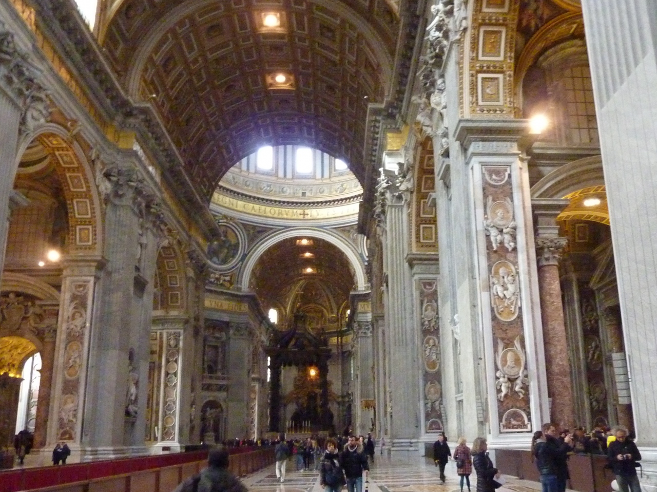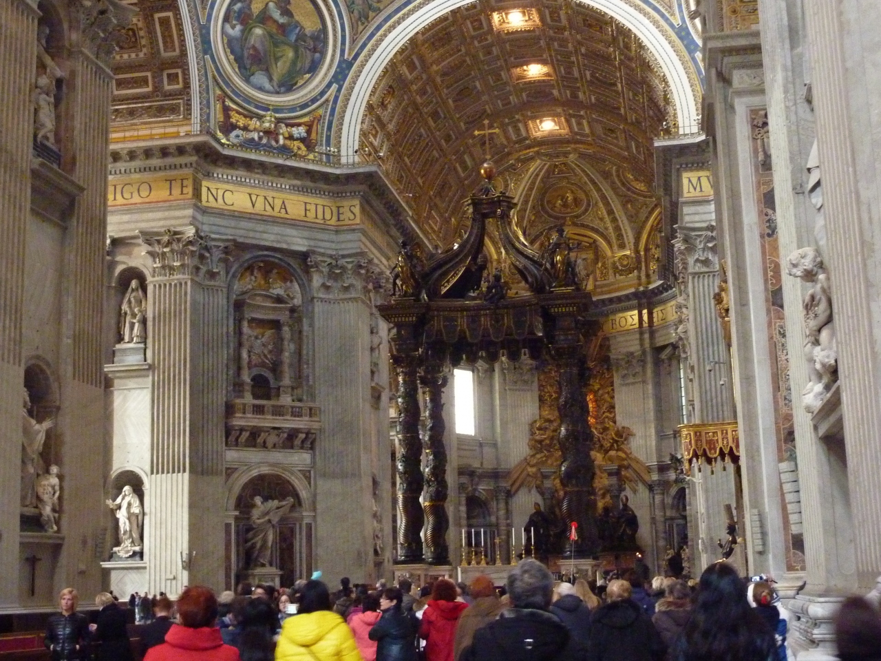 サンピエトロ大聖堂のクーポラの直下に法王のための祭壇があり、この祭壇を覆うのがベルニーニ作のブロンズの天蓋、バルダッキーノです。周囲の4本の柱部分はねじれが入り、独特の形状をしています。