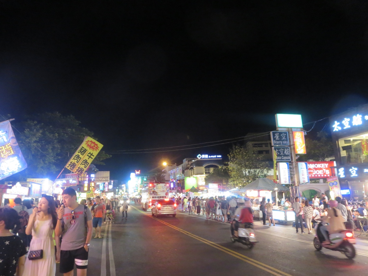 海辺の華やか夜市、バイク、車には注意!