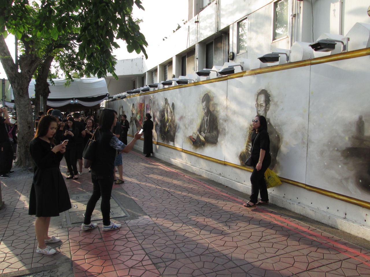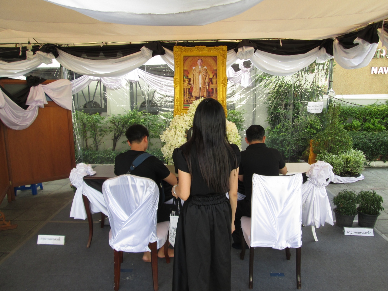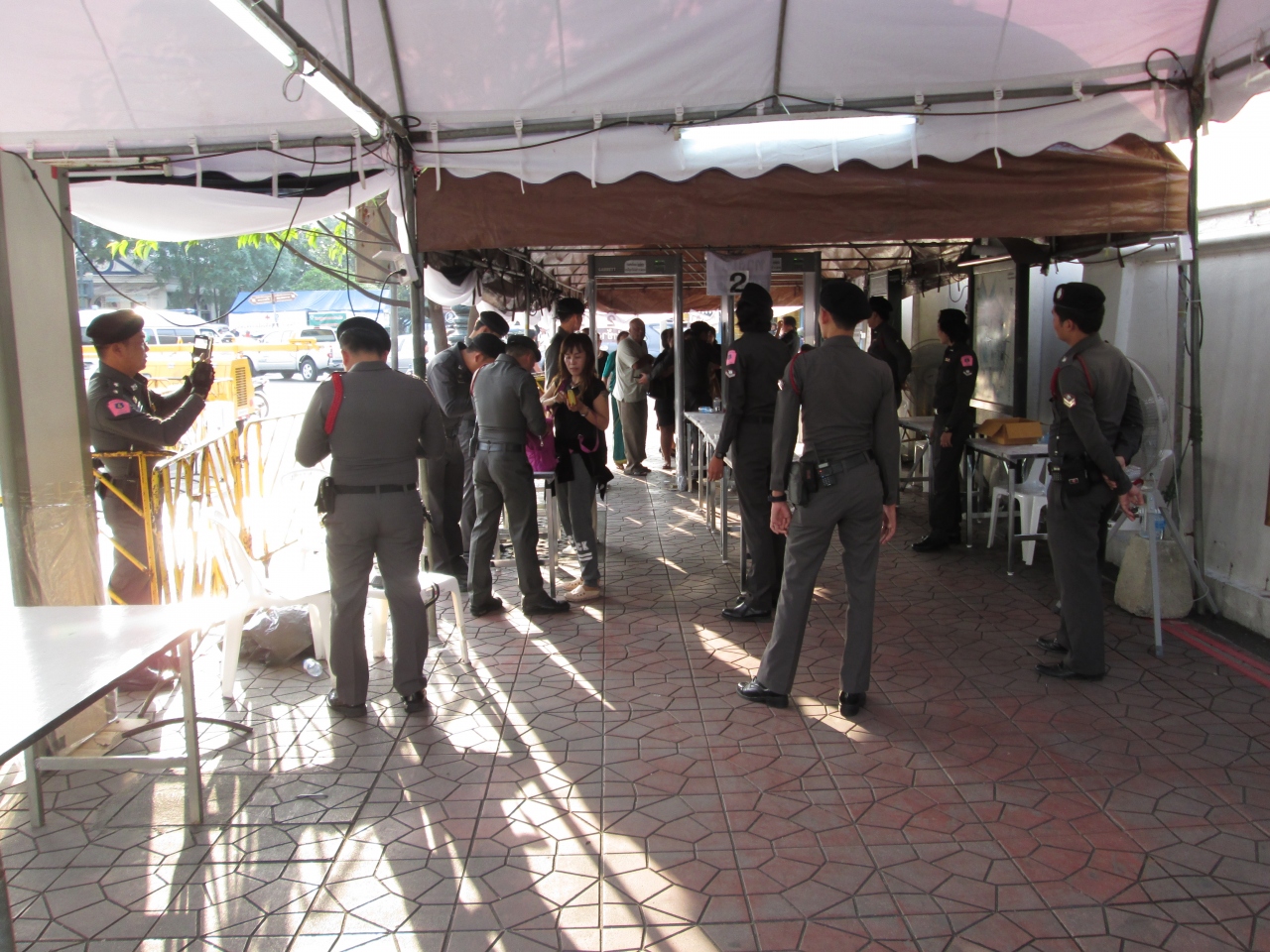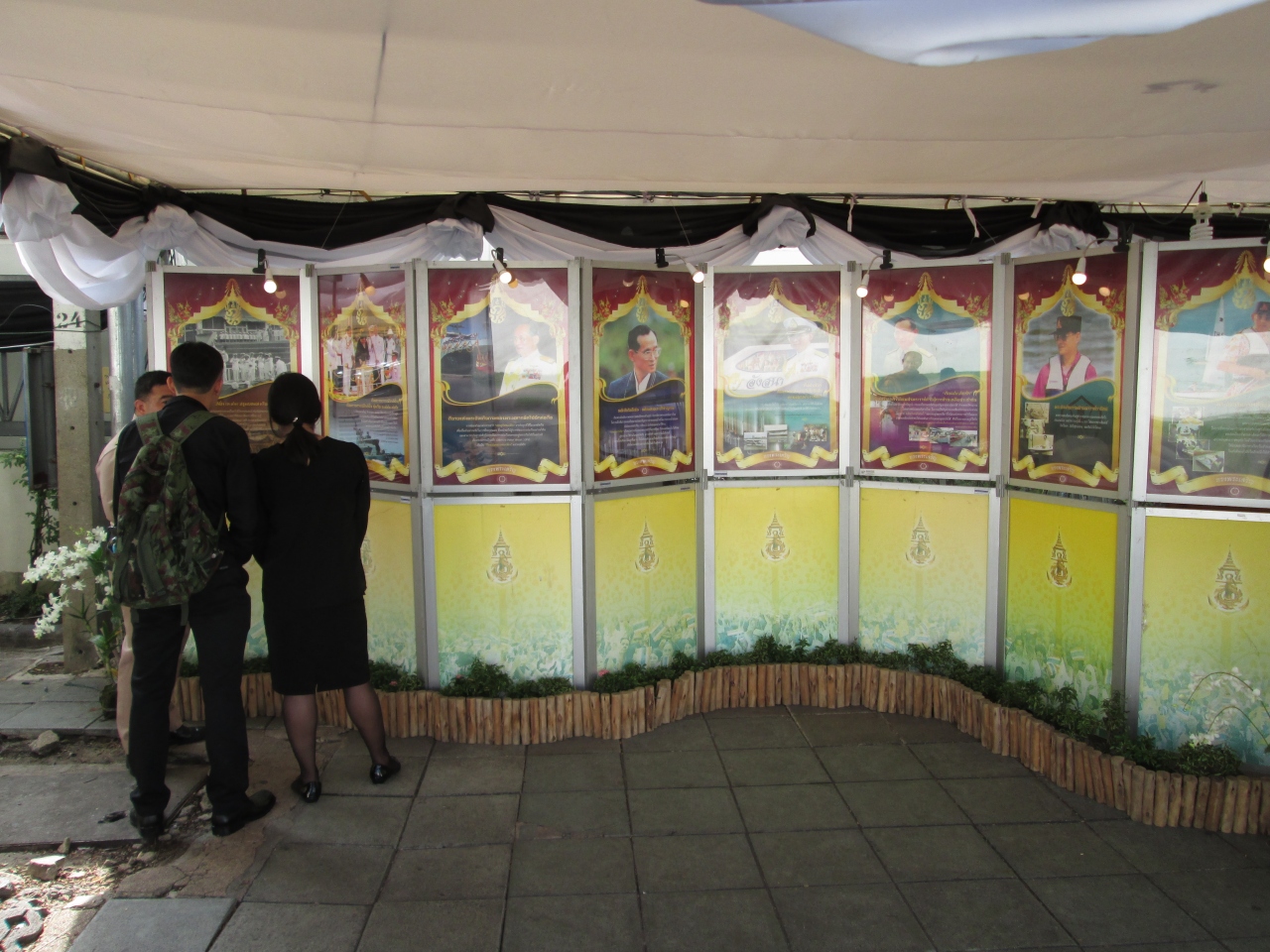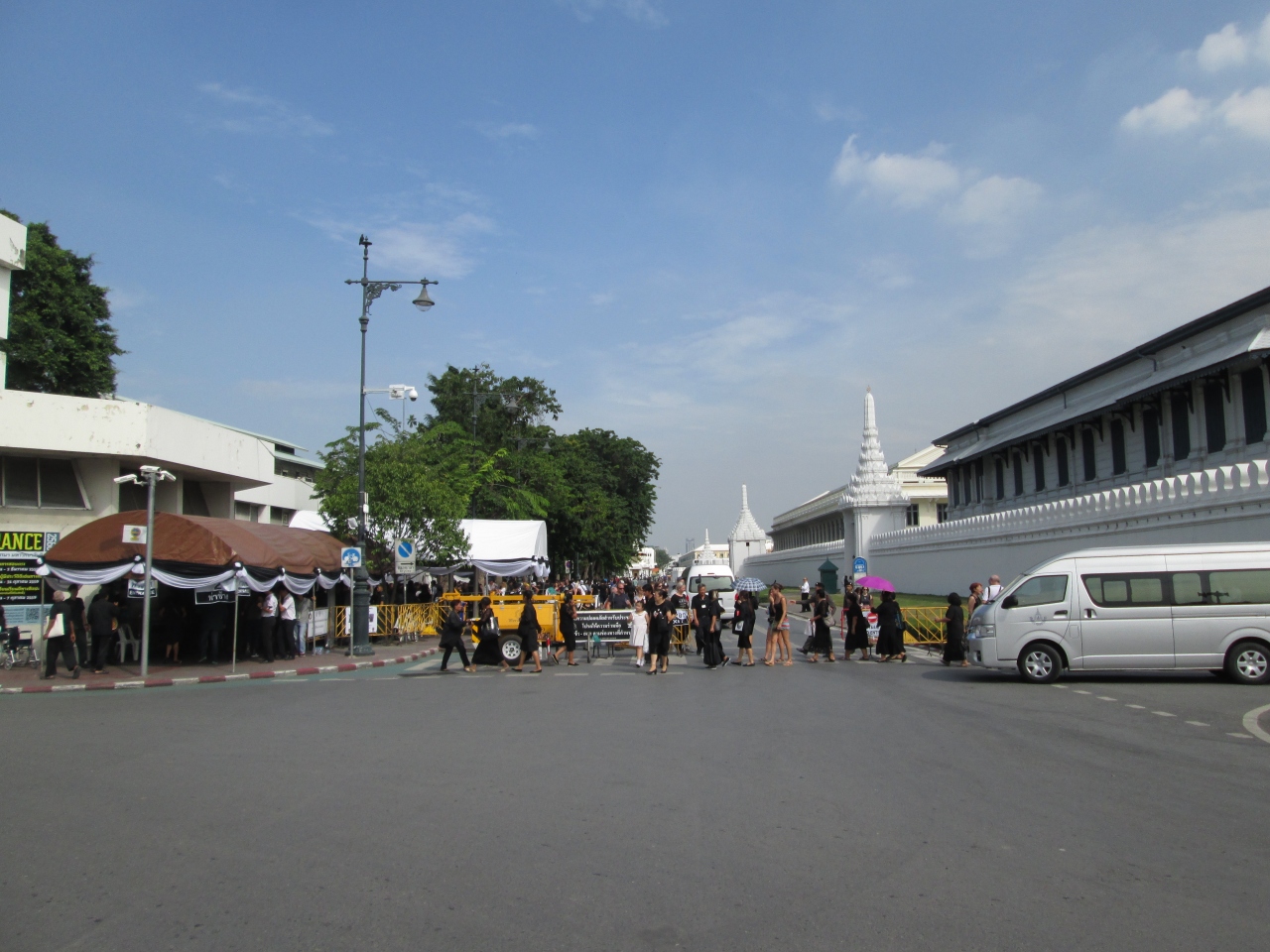 プミポン国王のご逝去に際して、国を挙げての服喪期間となっています。王宮、ワットプラケオ、サナムルアンでは一般弔問や葬儀イベントを行っており、タイ人がたくさん来訪していました。王宮周辺では、車両の進入に制限があり、この区間に入る際にIDチェック(パスポート)と手荷物検査がありました。手荷物は1人1人のかばんの中身をチェックし、バッグの小さいポケットも確認されました。
