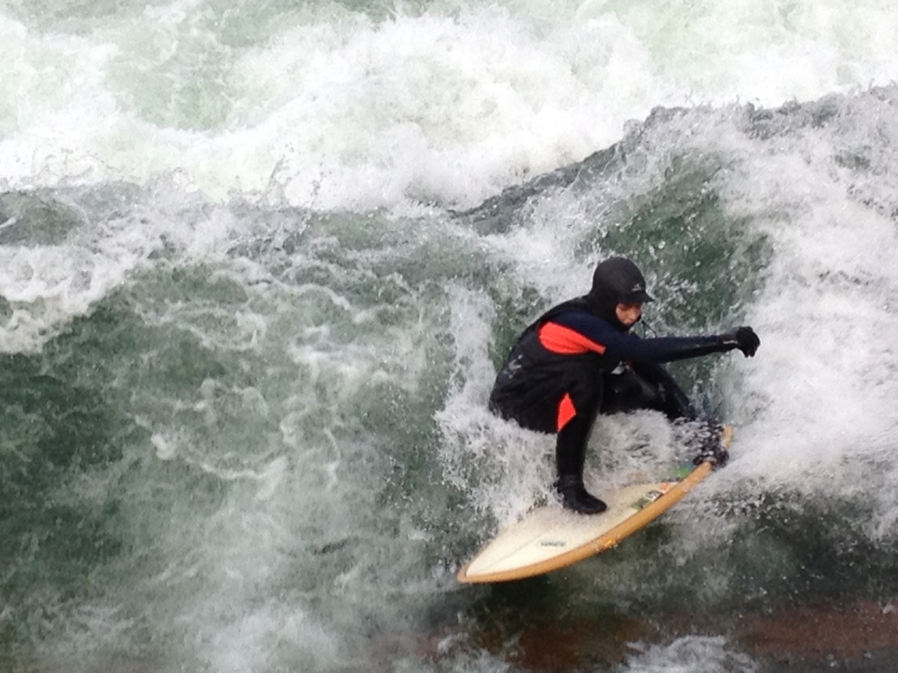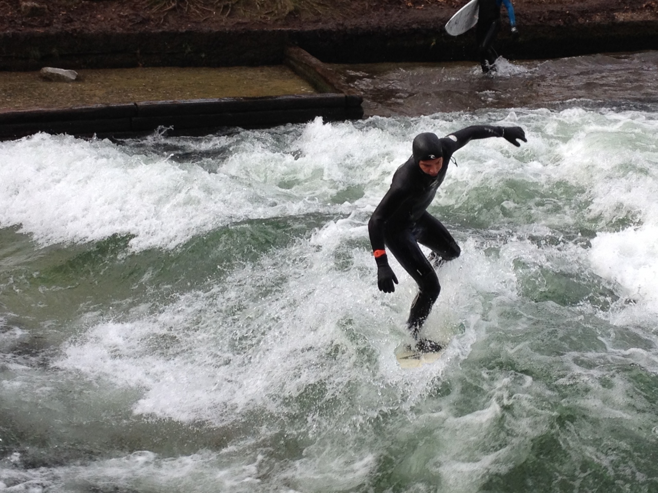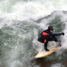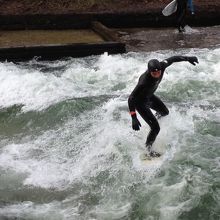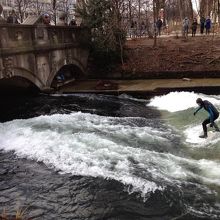TVで観たリバーサーフィンの様子が見たくて行って来ました。とても広い英国庭園の中を流れているアイスバッハ川には人だかりが!真冬でもやってました。幅の細い川で10人程のサーファーが順番よく波に乗ります。みんな上手でいつまで見ていても飽きることがないです。