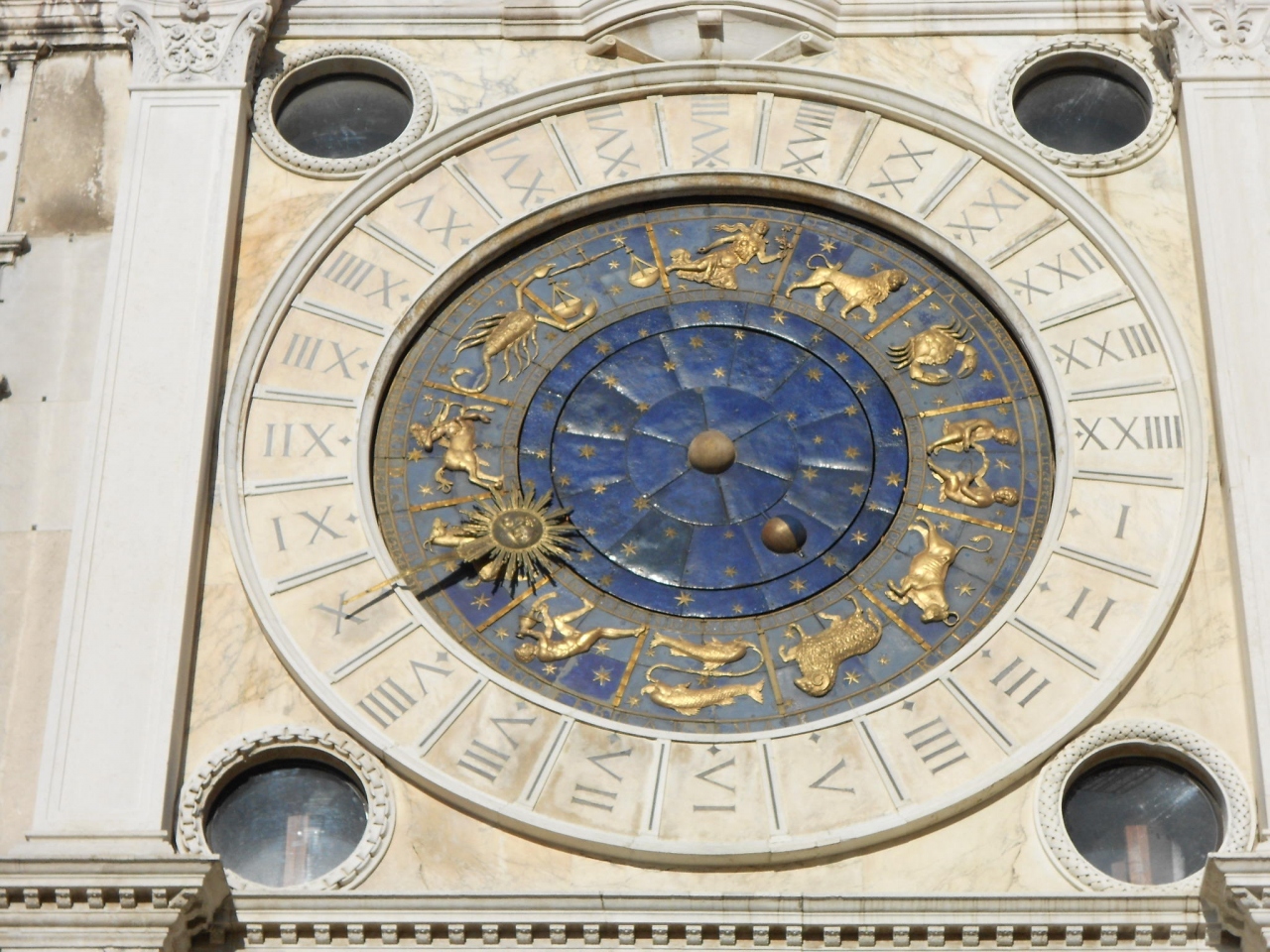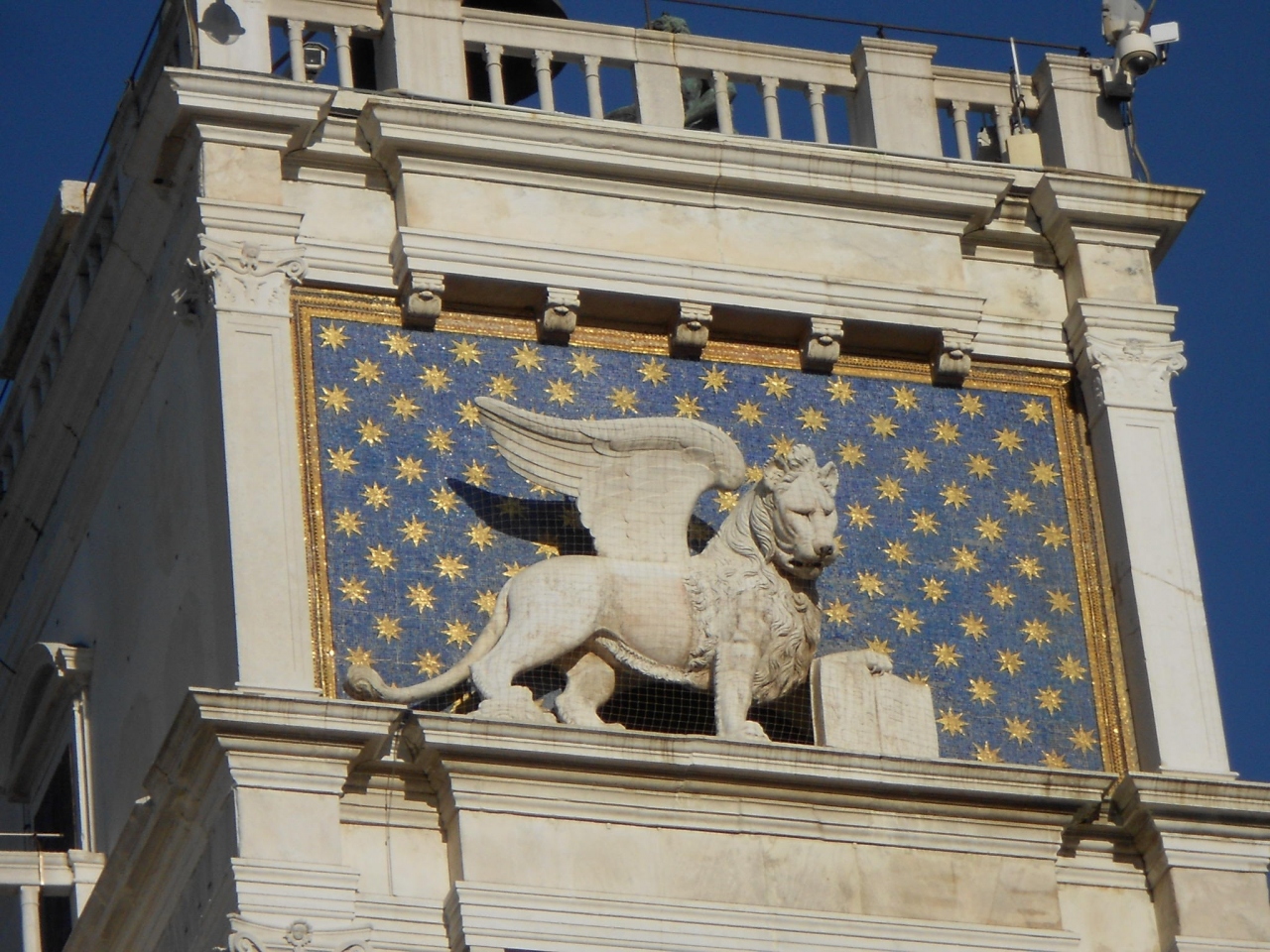 12星座がかたどられた時計の文字盤、翼のある獅子像が美しく青空に映えていました。