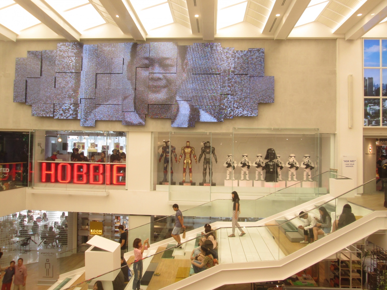 リニューアルオープンして売り場面積が広くなりました。1階は富裕層向けのシックな衣服が販売されていました。日本のショッピングセンターではないようなショップがあり、面白い嗜好のシステムがありました。上層階には若者向けのホビー店があり、スター・ウォーズのストームトルーパーやアイアンマンの人形が展示されていました。