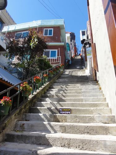 階段を下から見ると急な登りに圧倒されます。途中まで上ると展望台があり、ゆるやかな坂になっています。上まで上るとプサンの街の絶景が広がります。帰りは階段の横にあるエレベーターで下の降りました。エレベーターは全面ガラス張りになっており、景色も楽しめます。