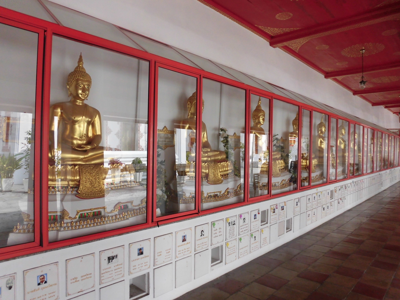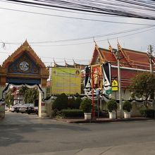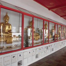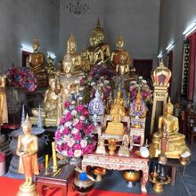 ワット・トライミットからチャオプラヤー川の方へ約400m行った所にありますので、時間があればついでに見学してくださいという感じのお寺です。入口が駐車場の入口にもなっていますが、その奥にお寺があります。多くの金色の仏像がガラスケースに入って回廊を取り囲んでいます。
